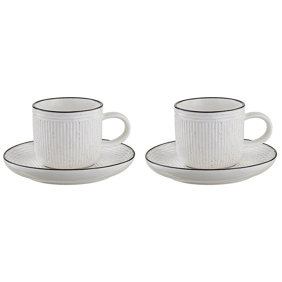 "Кофейная пара из белоснежного фарфора серии Contour станет неотъемлемой частью уютного чаепития. Рельефная поверхность и декоративная окантовка придают посуде оригинальный вид. Материал изготовления неприхотлив в уходе, не впитывает загрязнения, является экологичным и безопасным для здоровья. Набор идеально подходит как для повседневной, так и для праздничной сервировки стола.