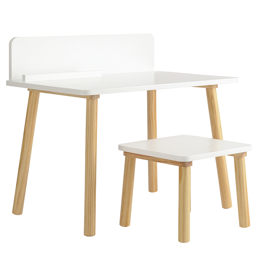 Материалы: древесина сосны, МДФ. Размеры: стол – 75х50х67 см, стул – 35х35х29 см. Высота столешницы: 50 см. Цвет: белый.