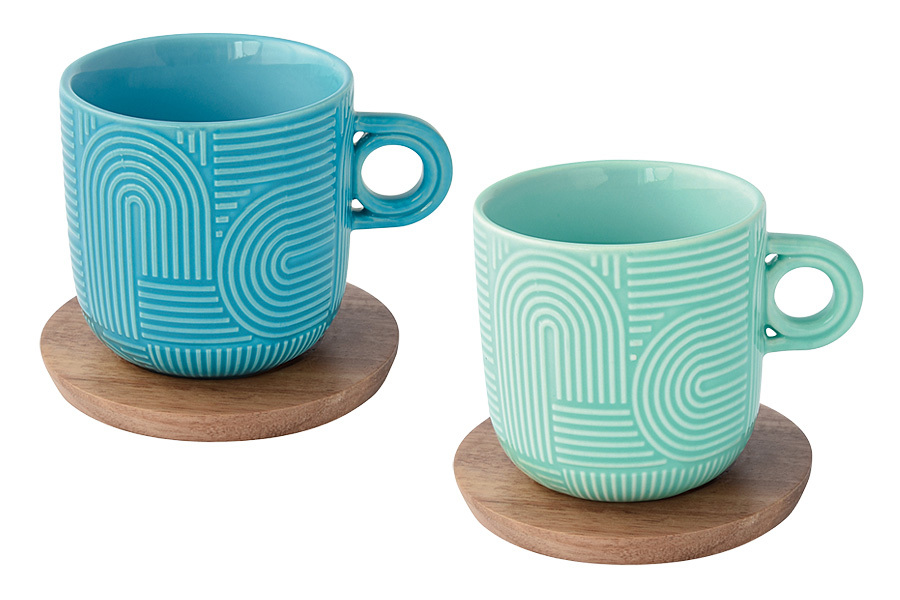 Чашка мятная 0,25 л - 1 шт, чашка морская волна 0,25 л - 1 шт, крышка-подставка из акации - 2 шт