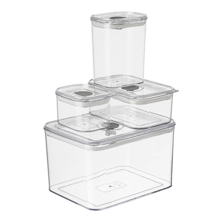 Материалы: пластик SAN, силикон. Размеры: 9х7х6 см, 9х7х11,5 см, 14,5х9х11,5 см, 18,5х14,5х11,5 см. Объемы: 190 мл, 440 мл, 1л, 2,3 л. Количество в наборе: 4 шт.