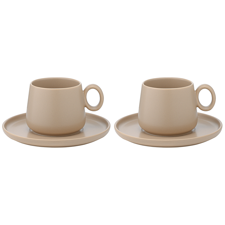 "Набор из двух фарфоровых чайных пар нежного бежевого цвета подойдет как для праздничной сервировки, так и для ежедневного чаепития. Сдержанный скандинавский дизайн чашек и блюдец станет украшением вашей кухни, а необычная форма будет радовать каждый день. Гладкая фарфоровая поверхность с приятным, чуть приглушенным глянцем благородно выглядит и вместе с тем очень практична — не царапается и легко отмывается от загрязнений. Чайные пары можно дополнить другими предметами из серии Essential — например, тарелками, блюдами и салатниками.