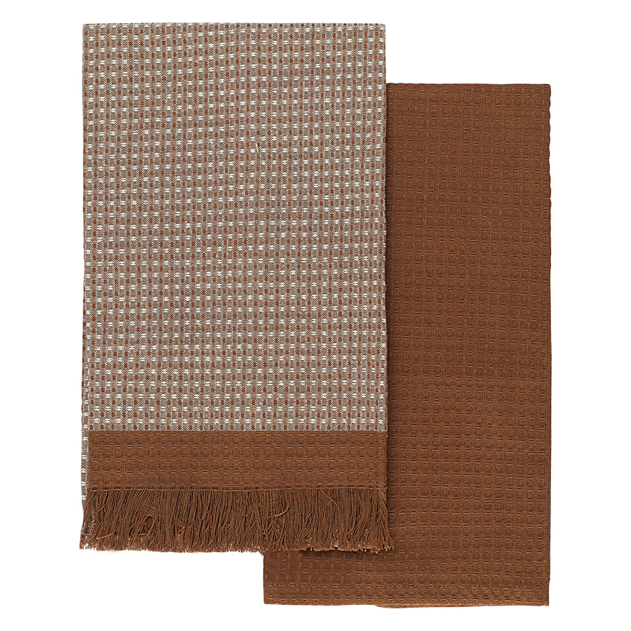 "Набор из двух кухонных жаккардовых полотенец коричневого цвета из коллекции Essential станет помощником на кухне и настоящим украшением интерьера. Изделия выполнены из 100%, хлопка. Нежный и прочный материал очень практичен — хорошо впитывает влагу, быстро сохнет и не оставляет на посуде ворсинок при протирании. Полотенца имеют удобную петельку для подвешивания на крючок.