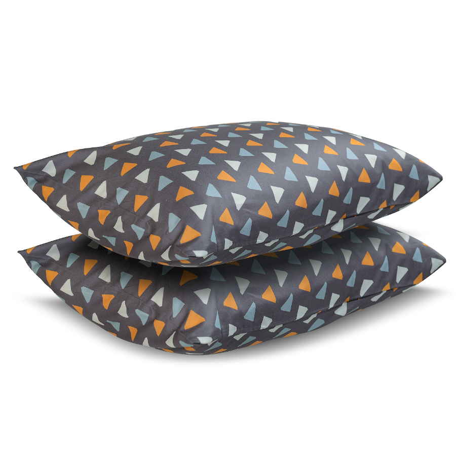 "Комплект из двух наволочек с геометричным принтом Triangles в сочетании с насыщенным темно-серым цветом станет прекрасным дизайнерским акцентом в интерьере любой спальни. Гладкий, приятный на ощупь материал плотностью 210 ТС отличается особым способом пряжи – нити переплетаются в скрученном виде, что придает ткани дополнительную прочность.