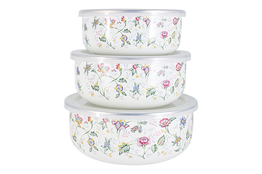 Миска, 3 шт, 14 см/16 см/18 см, с крышкой, с покрытием, сталь/ПВХ, белая, Цветы, Buckingham