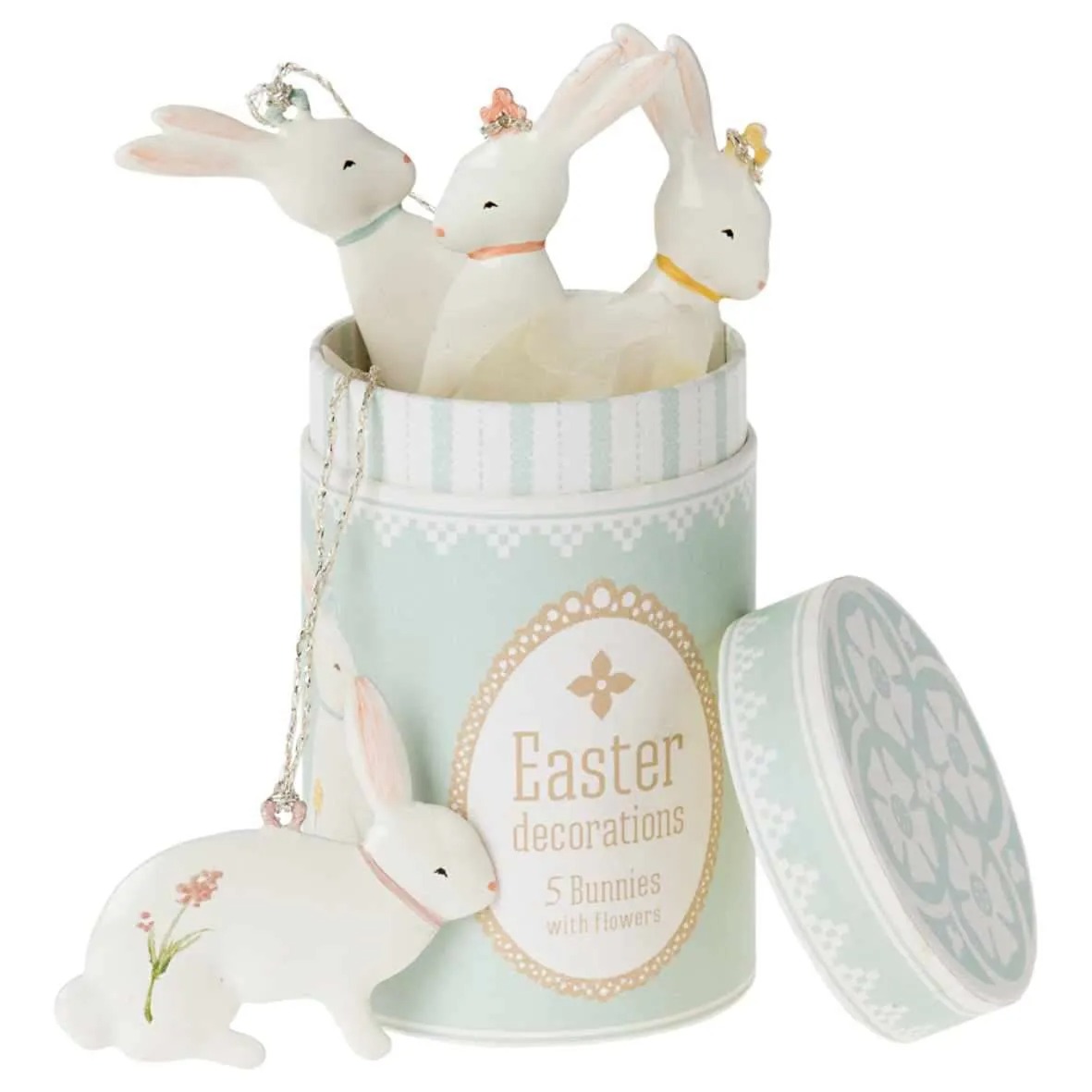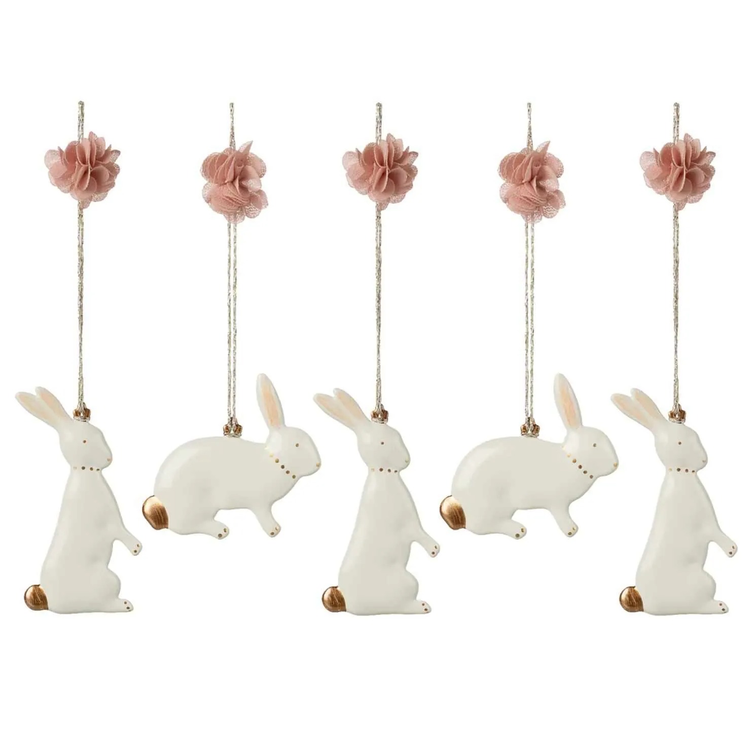 Металлические пасхальные зайчики с ручной росписью и мягким помпоном на ленте золотистого цвета. Красиво украсят ветку или пасхальный стол. В каждом комплекте пять зайчиков. Миксуйте украшения Maileg для создания своей собственной коллекции.