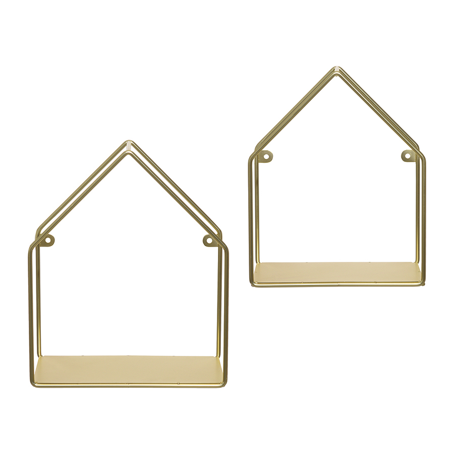 "Набор настенных полок Cenci, выполненный в современном минималистическом стиле, идеально подойдет для любого современного интерьера. Каркасы изделий изготовлены из прочной стальной проволоки с отделкой под , ,золото. Основаниями служат прямоугольные металлические пластины, окрашенные в цвет каркаса, на которые можно поставить горшки с комнатными растениями, книги или сувениры. Прочные стальные конструкции не занимают много места и подвешиваются прямо на стены в прихожих, спальнях или любых других комнатах. В комплект входят две полки.