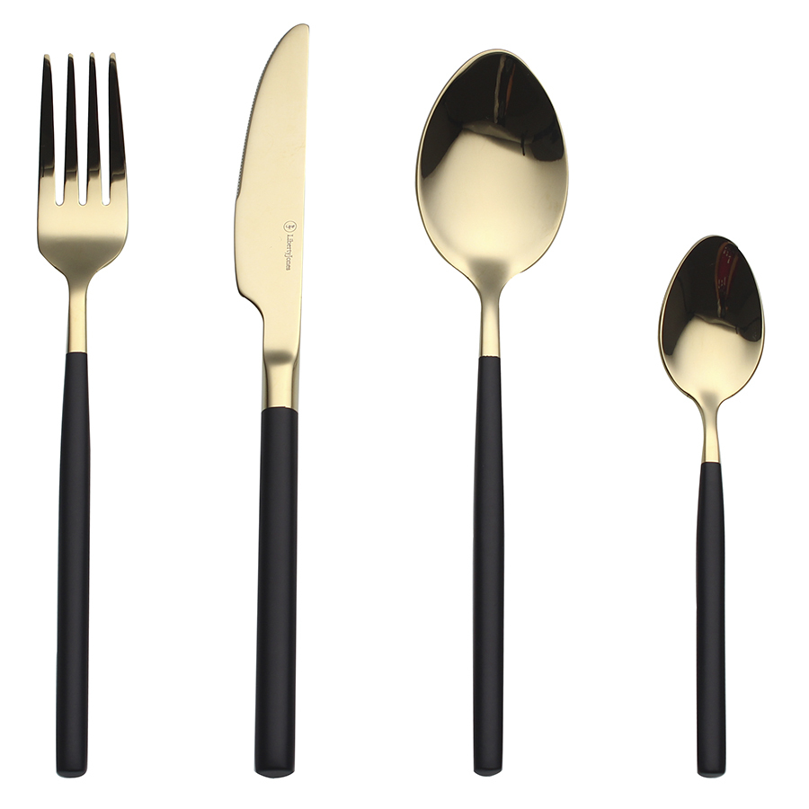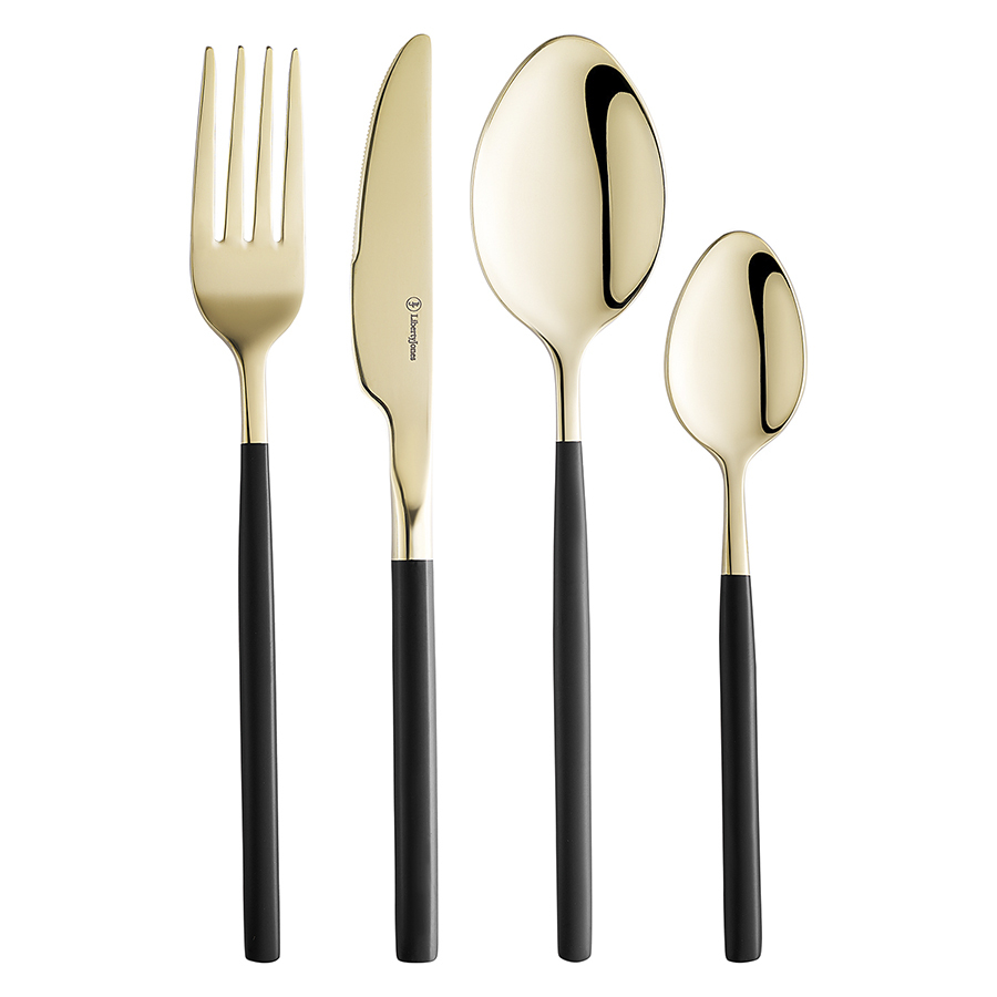 "Столовые приборы Duality золотистого цвета с черными ручками украсят любую сервировку и подчеркнут вашу любовь к красивым предметам. Набор включает: 4 ножа, 4 вилки, 4 столовые ложки и 4 чайные ложки.