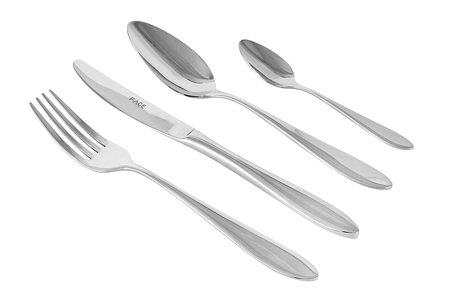 12 столовых ложек, 12 чайных ложек, 12 кофейных ложек, 12 столовых вилок, 12 десертных вилок, 12 столовых ножей, половник, лопатка, ложка сервировочная