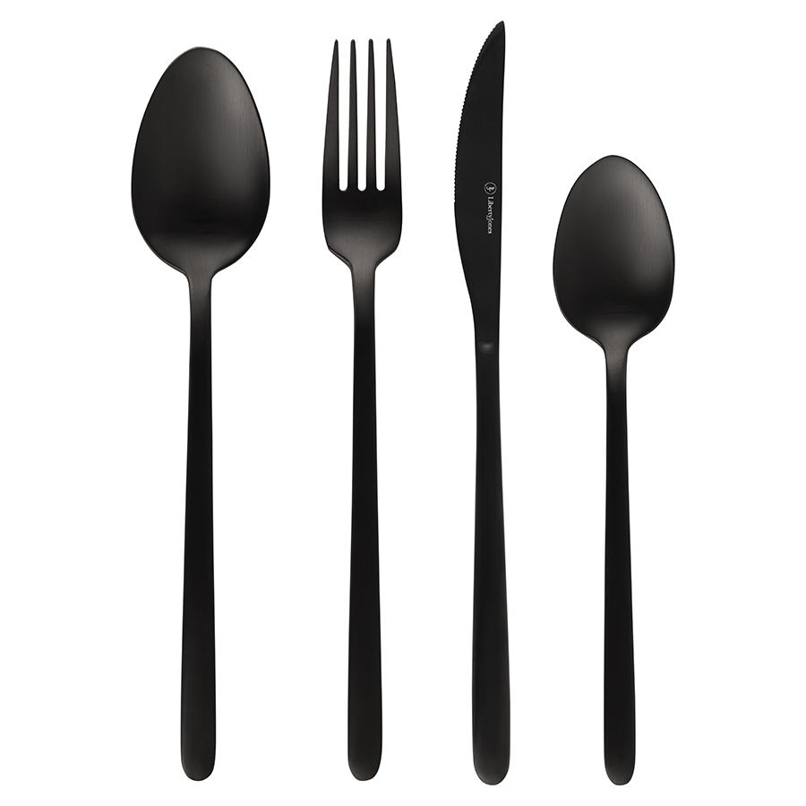 - Столовые приборы черного цвета с матовой полировкой идеально вписываются в современные решения и могут служить акцентом на фоне простых и лаконичных элементов.