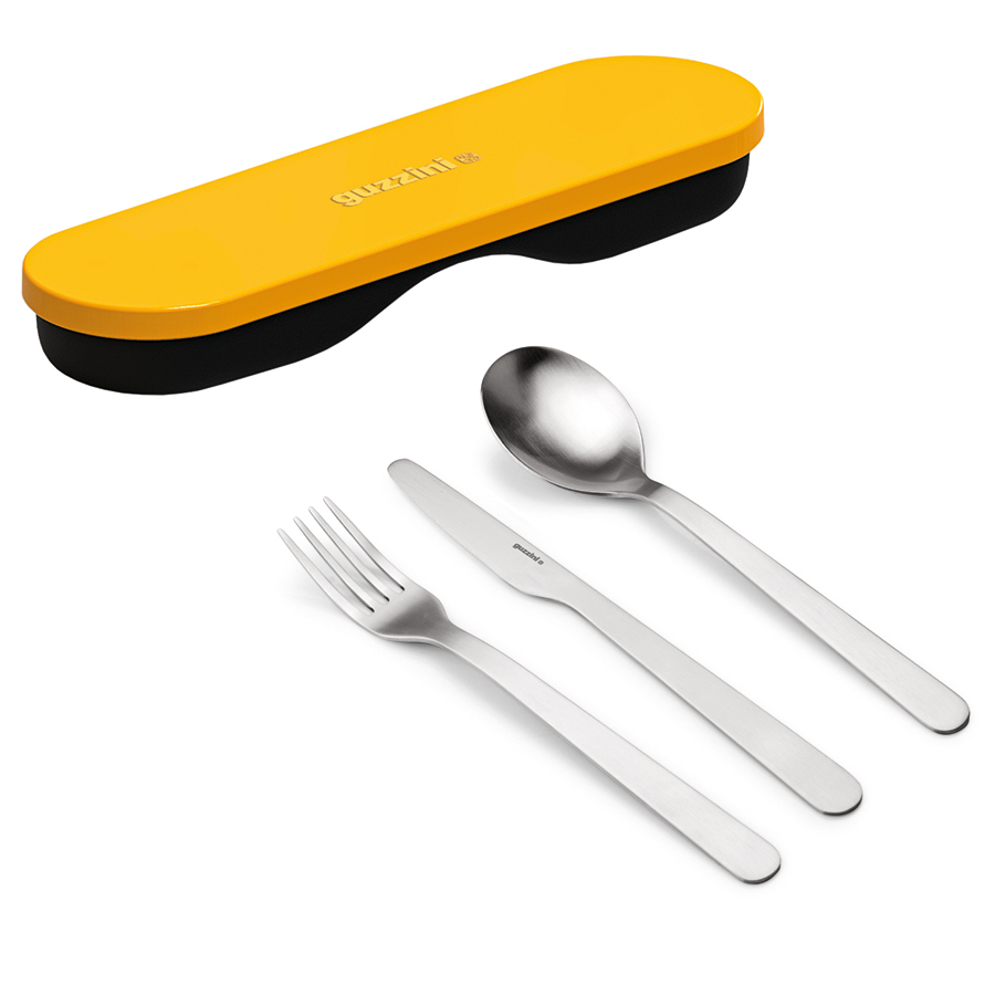 "Компактный набор из 3 столовых приборов в футляре On The Go поможет насладиться завтраком или обедом в офисе, в университете, на пикнике или в поездке. В комплект входит ложка, вилка и нож из высококачественной нержавеющей стали. Изделия можно мыть в посудомоечной машине. Благодаря удобному футляру столовые приборы будут защищены от загрязнения и не затеряются в сумке или рюкзаке."