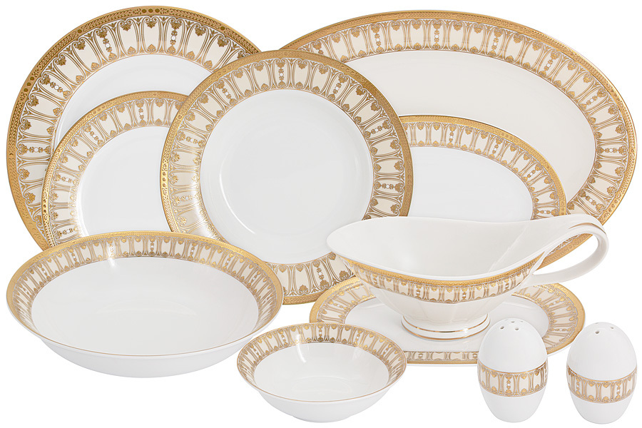 12 закусочных тарелок 20,5 см, 12 обеденных тарелок 27 см, 12 суповых тарелок 23 см, 2 салатника 23 см, 4 салатника 14 см, 2 блюда 23 см, 2 блюда 35 см, соусник с блюдцем, солонка, перечница