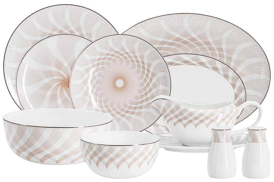 6 обеденных тарелок 27 см, 6 суповых тарелок 20,5 см, 0,3 л, 6 закусочных тарелок 21 см, 1 салатник 20,5 см, 1,85 л, 2 салатника 14,5 см, 0,75л, 1 блюдо 36см, 1 блюдо 26 см , соусник 0,4 л, блюдо под соусник, солонка, перечница