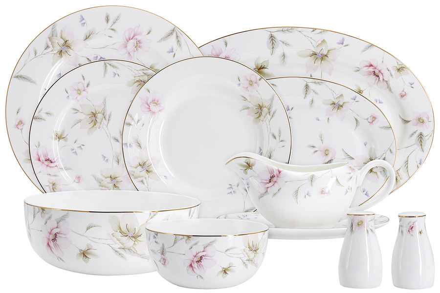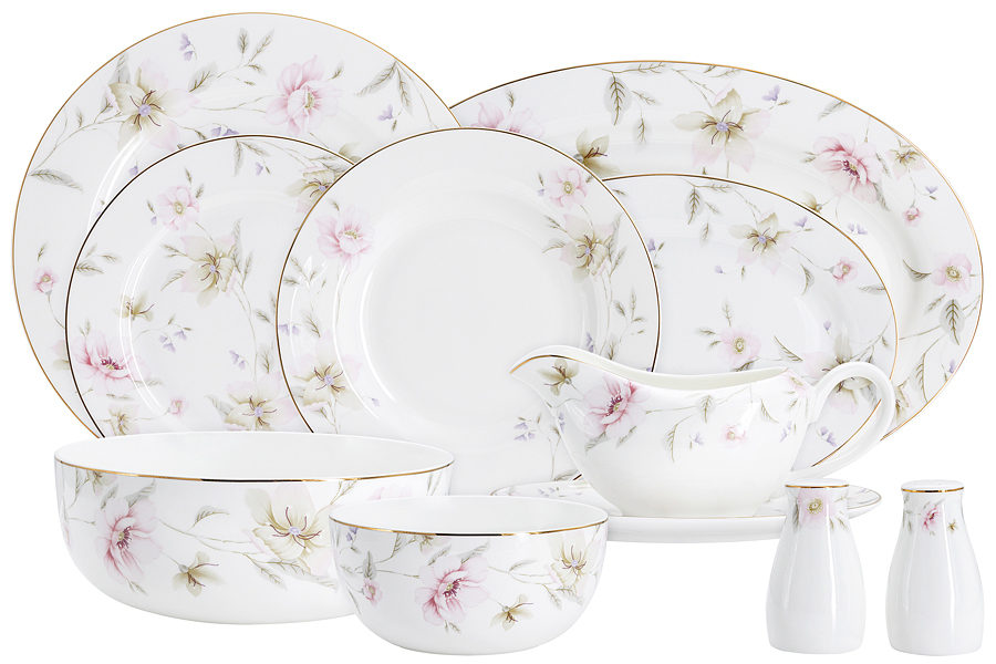 6 обеденных тарелок 27 см, 6 суповых тарелок 20,5 см, 0,3 л, 6 закусочных тарелок 21 см, 1 салатник 20,5 см, 1,85 л, 2 салатника 14,5см, 0,75 л, 1 блюдо 36 см,1 блюдо 26 см, соусник 0,4 л, блюдо под соусник, солонка, перечница