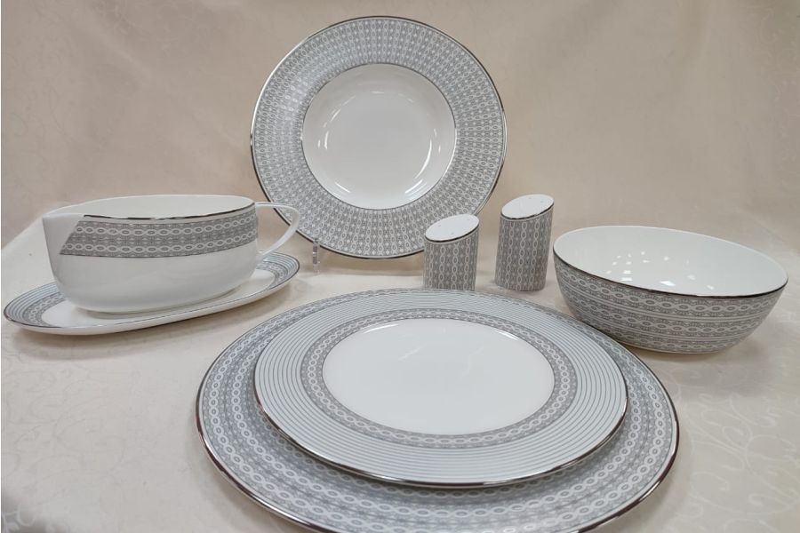 Сервиз обеденный, 6 перс, 27 пр, фарфор F, серо-белый, с серебристым кантом, Цепочки, Silver