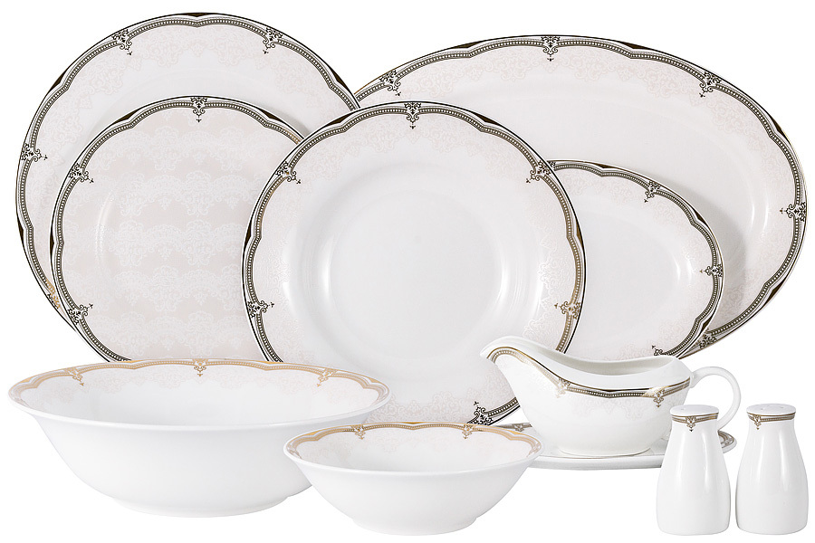 Обеденный сервиз Вивьен комбинированный имеет орнаменты 2-х цветов на разных предметах: на всех тарелках, блюдах, соуснике с блюдом и наборе для специй - орнамент цвета тёмного золота, на всех трёх салатниках - золотой орнамент