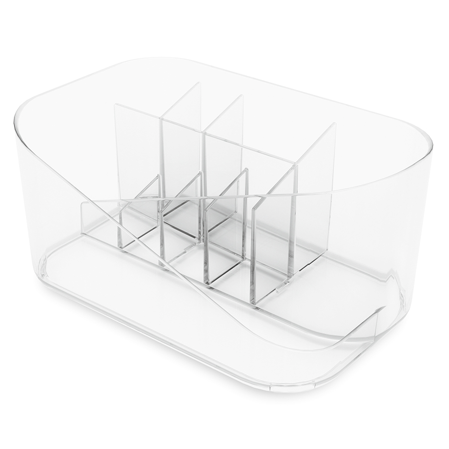 "В органайзере Glam можно хранить все необходимое для повседневного макияжа благодаря отделениям разного размера и съемной вставке. Легкий, компактный и удобный в использовании, он обеспечивает быстрый доступ к необходимым средствам, не занимает много места в ванной и на туалетном столике.