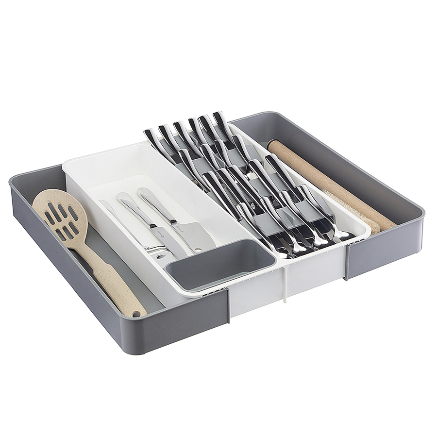 "Органайзер Abdi поможет компактно разместить столовые приборы и другие кухонные принадлежности. Изделие выполнено из полистирола – безопасного в использовании материала, устойчивого к влаге, перепадам температуры и простого в уходе. Конструкция отличается лаконичным дизайном, что позволяет вписать ее в любой современный интерьер.
