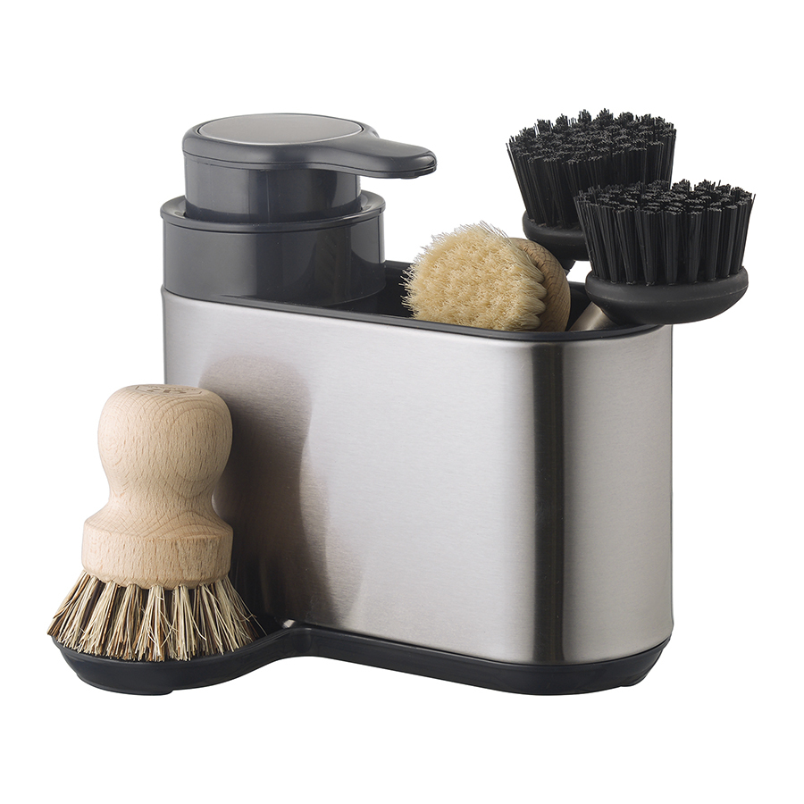 "Органайзер Atle позволяет компактно разместить диспенсер с жидким средством, губку и щетку для мытья посуды на кухонной мойке или столешнице. Изделие выполнено из прочного и устойчивого к износу АБС-пластика и нержавеющей стали. Стильный контейнер в универсальном цветовом решении органично вписывается в различные варианты оформления интерьера.