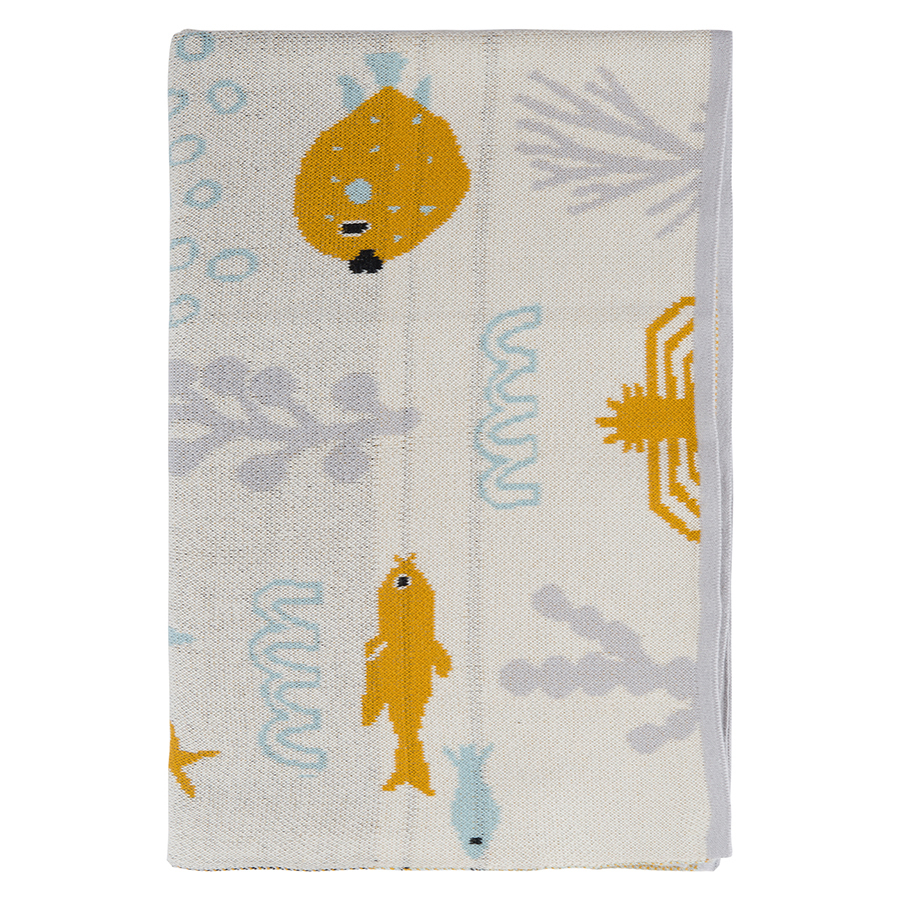 "Плед из хлопка с принтом Oceania world из коллекции Tiny world станет украшением детской комнаты или коляски, его можно взять с собой на пикник или на пляж, в поездку на машине. Стилизованные морские обитатели могут стать темой для полезных разговоров даже с маленькими детьми. Материал: натуральный хлопок – гипоаллергенный и приятный на ощупь материал, что особенно важно при контакте с детской кожей. Плотность ткани - 380GSM. Изделие упаковано в брендированную крафтовую коробку.