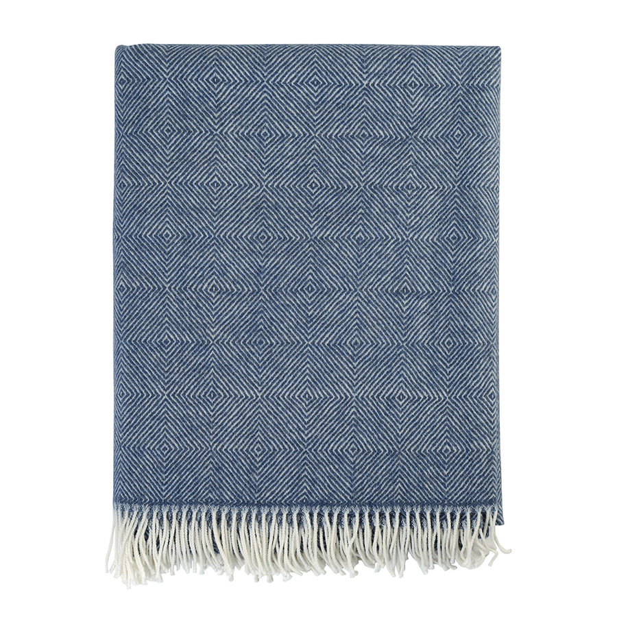 "Синий плед с белоснежной бахромой по краям украсили фактурным микроузором. Приятный на ощупь аксессуар выполнен из тонкой и при этом теплой шерсти мериноса. Такой материал мягче натурального шелка и в несколько раз эластичнее хлопка. Изделие упаковано в крафтовую коробку.