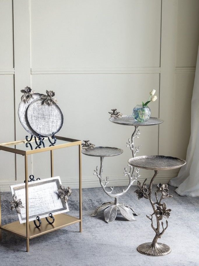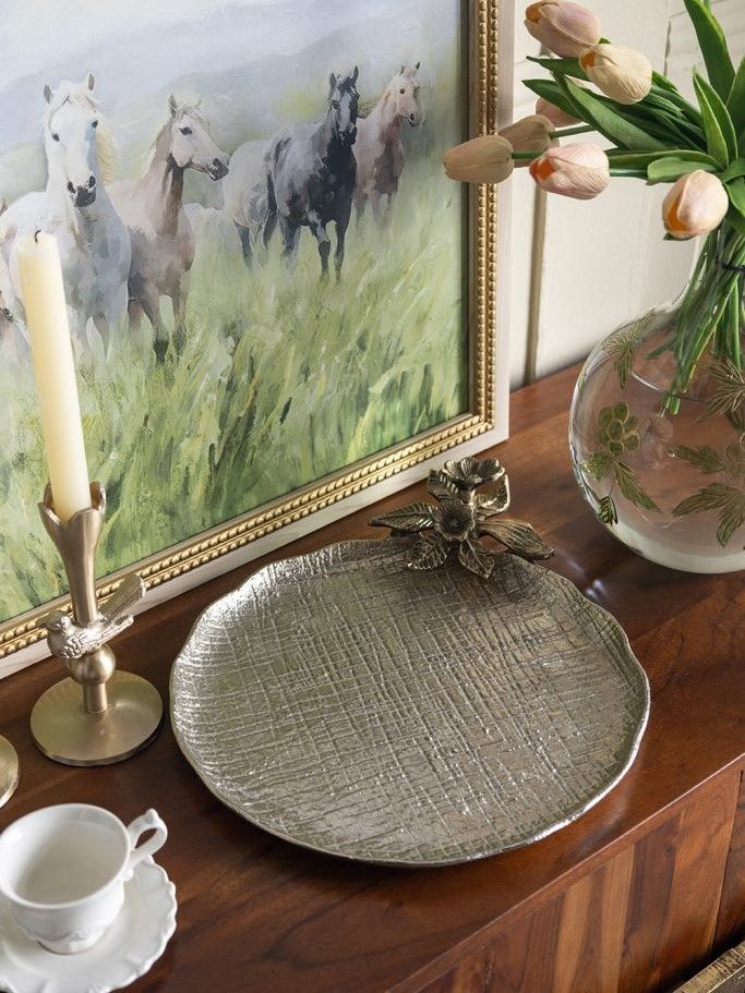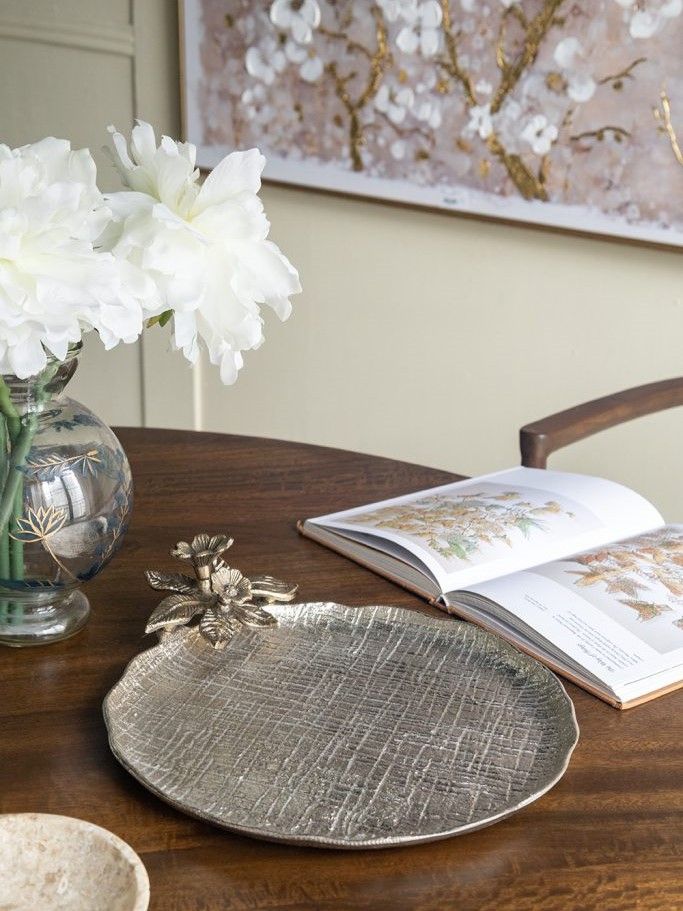 Декоративный поднос с природным очарованием отличается круглой формой, текстурированной серебристой отделкой и украшено золотистым соцветием. Поднос можно использовать для подачи напитков, сервировки стола, а также в качестве яркого украшения и создания акцентной композиции. Идеально подходит для традиционных, современных, арт-деко и минималистичных интерьеров, органично вписываясь в любой интерьер.