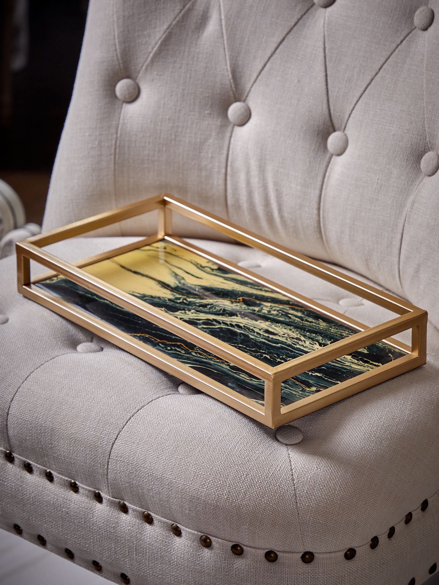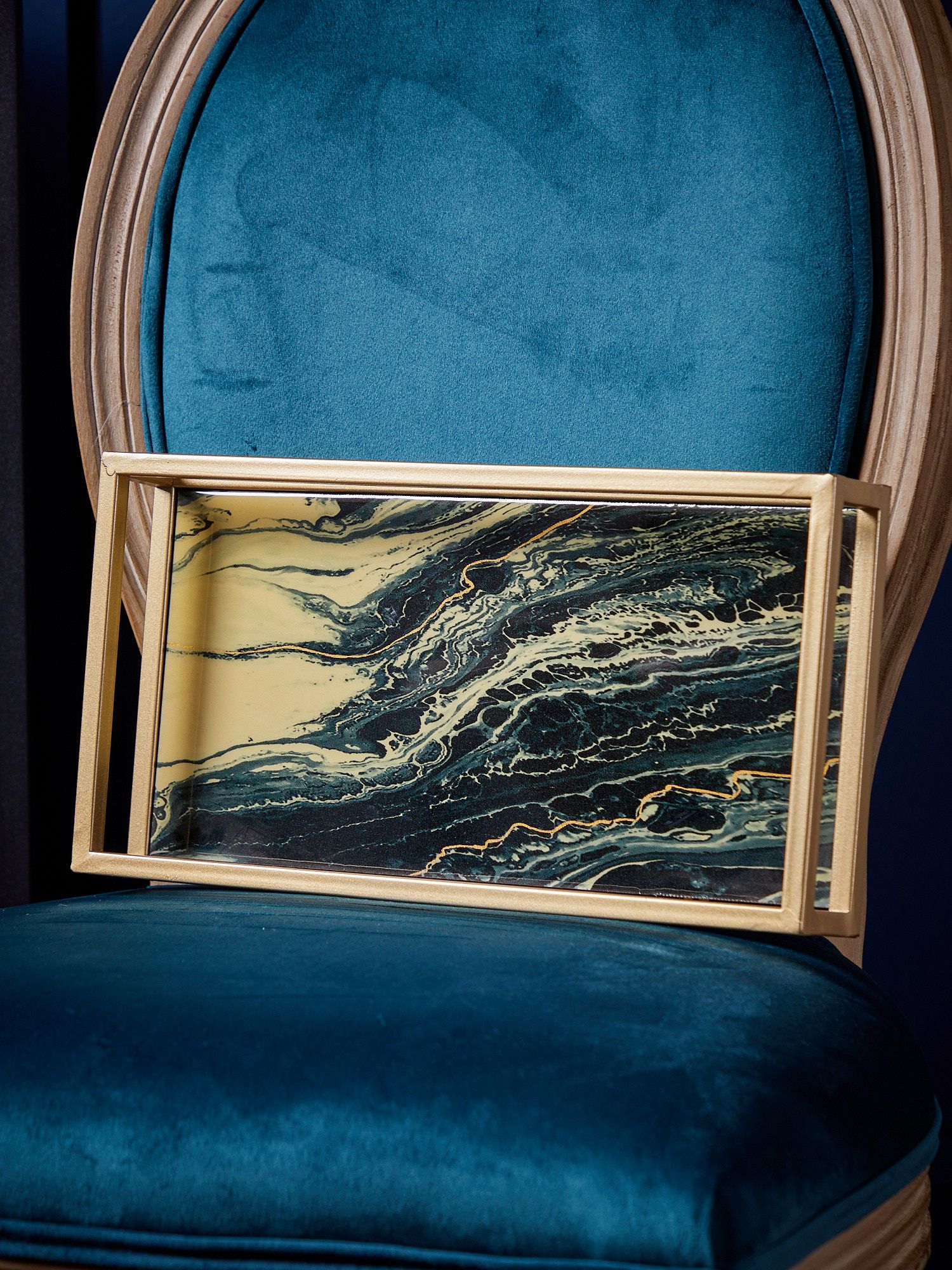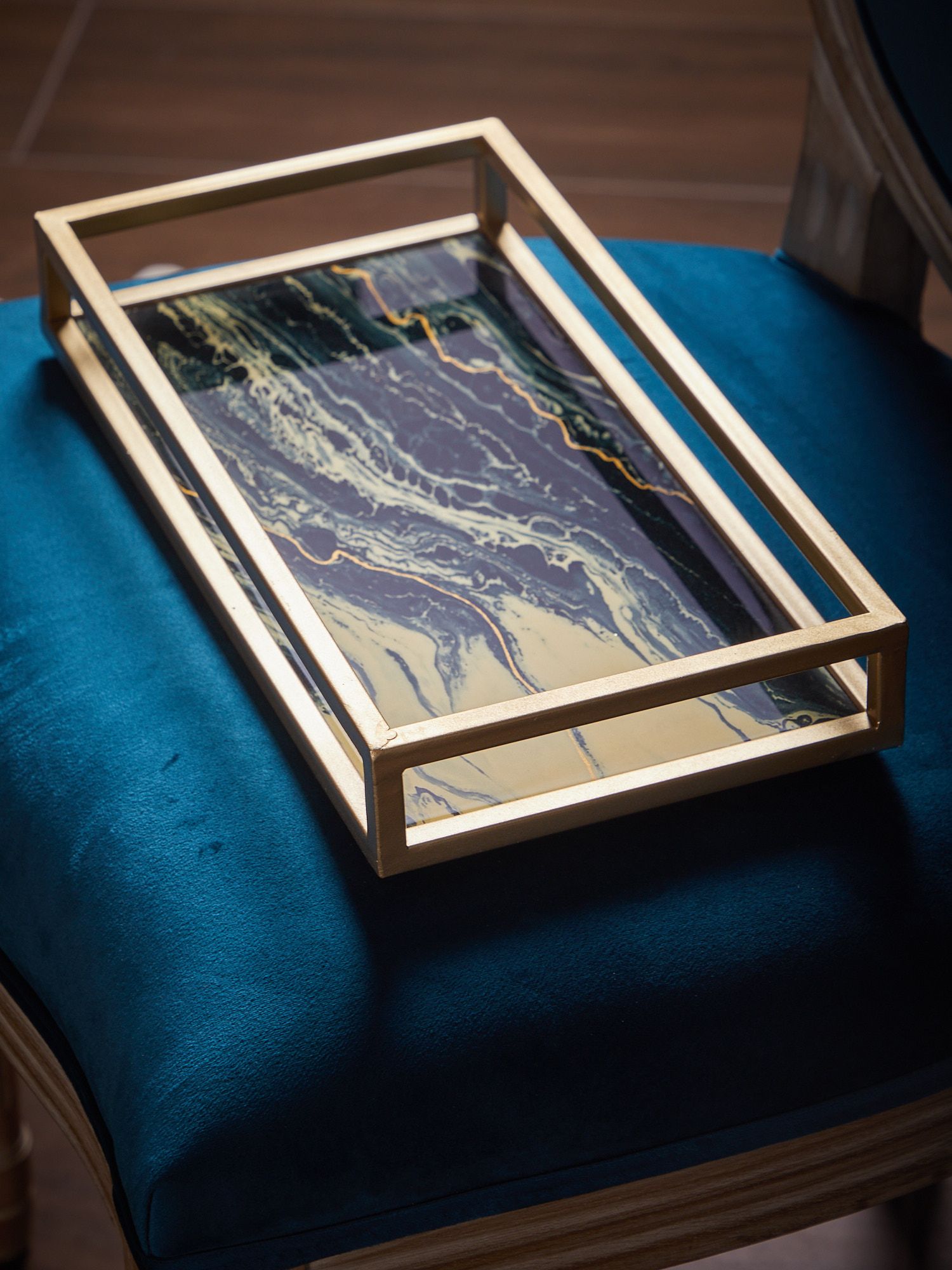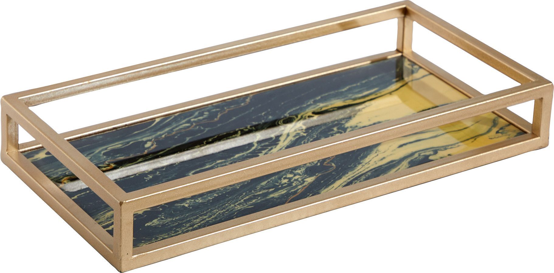 Классическое сочетание черного и золотистого оттенков, с абстрактной иллюстрацией на стеклянной поверхности, позволяет этому подносу придать ощущение элегантности любому пространству. Он подходит как для стильной подачи блюд, так и в качестве декорации, придающей помещению новую атмосферу.