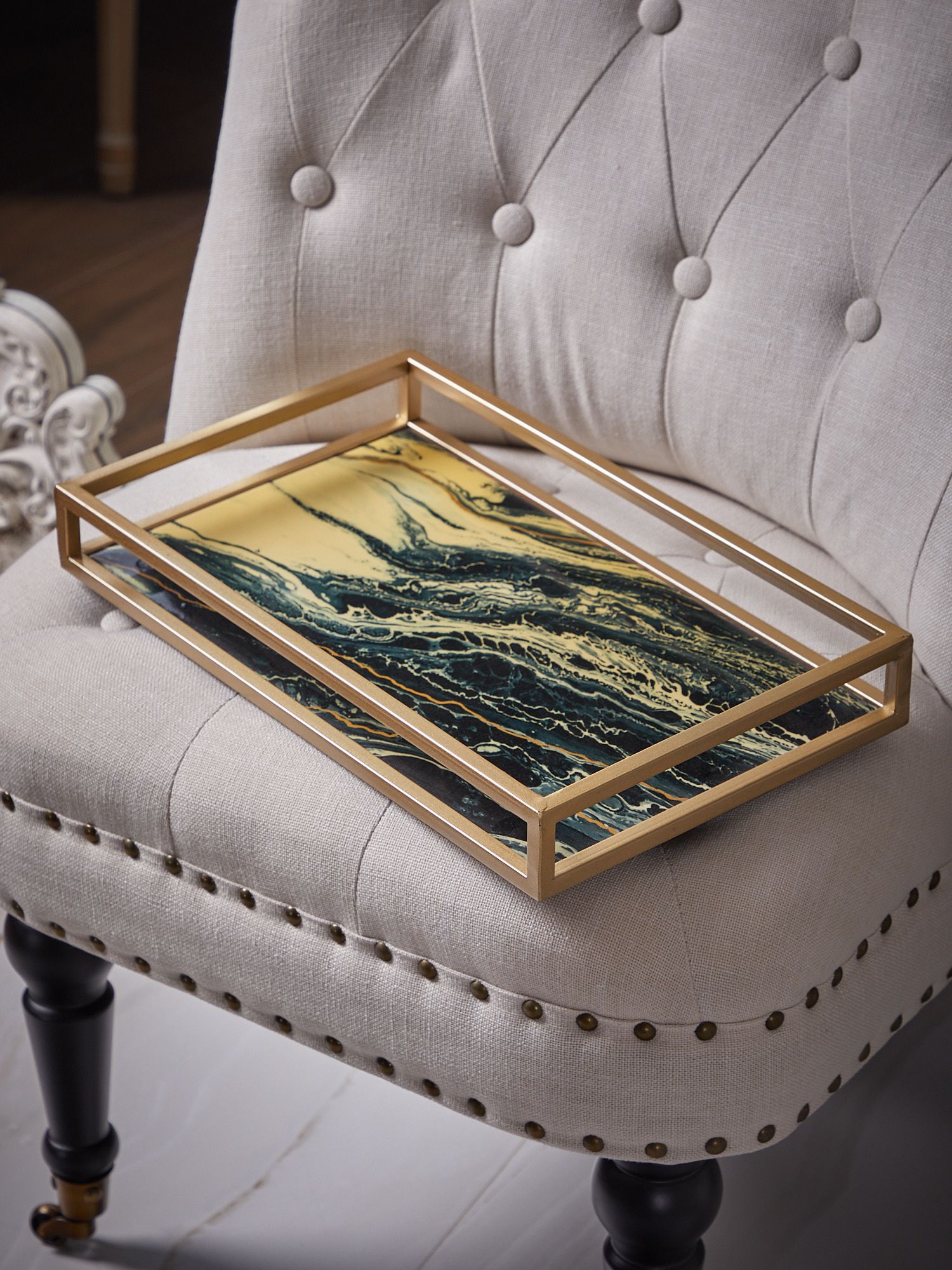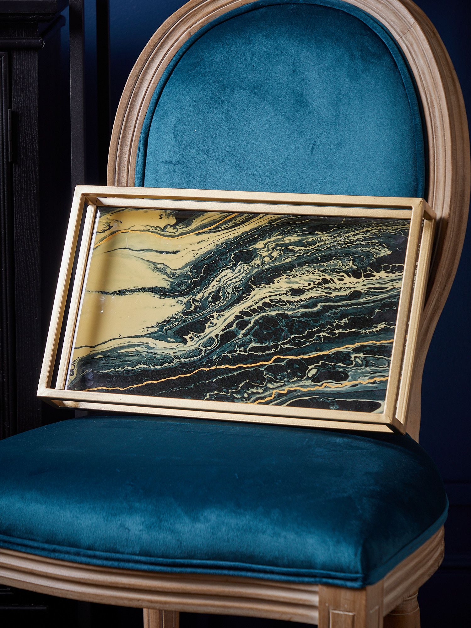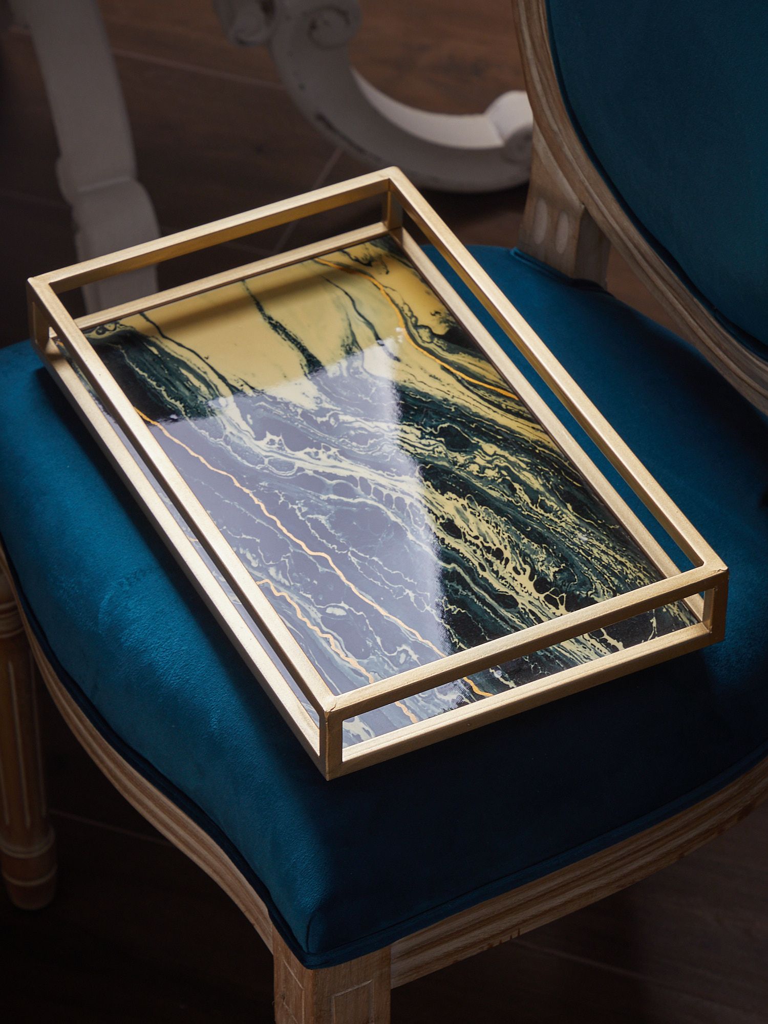 Классическое сочетание черного и золотистого оттенков, с абстрактной иллюстрацией на стеклянной поверхности, позволяет этому подносу придать ощущение элегантности любому пространству. Он подходит как для стильной подачи блюд, так и в качестве декорации, придающей помещению новую атмосферу.