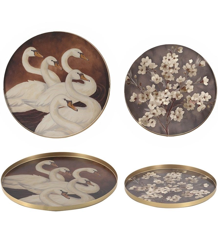 Превосходный набор из двух подносов разного размера, сочетающий в себе винтажный дизайн и непринужденное очарование природы, имеют круглую форму с низкими бортами и украшены сказочными мотивами в виде стаи лебедей и распустившегося сада. Изделия идеально подходят для сервировки напитков и закусок, размещения цветочных композиций, или демонстрации других предметов, украшая любую поверхность стола в гостиной, прихожей или спальной комнате, при этом органично дополняя традиционные, эклектичные и переходные стили интерьера.