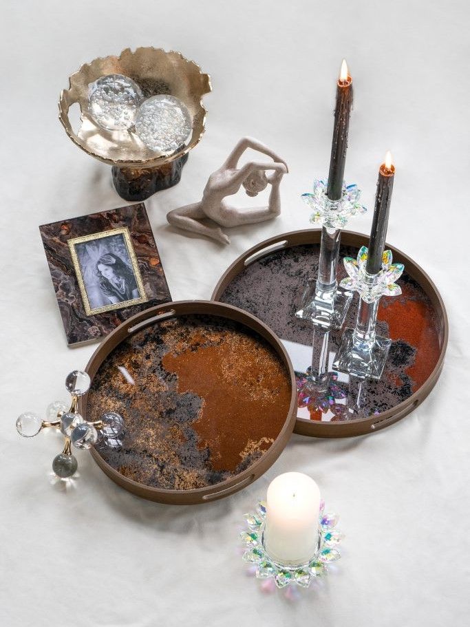 Яркий дуэт из двух декоративных подносов с рисунком многоцветного искусственного мрамора завораживает своей красотой и многогранностью. Любая поверхность заиграет новыми красками с такими предметами интерьера. Независимо от того, используете ли вы их для демонстрации ярких акцентов или для организации фуршета, изделия обязательно украсят любое пространство. Изящный мраморный узор и плавные линии позволяют этой паре подносов дополнять современный, эклектичный и гламурный стили, благодаря чему они органично впишутся в любой интерьер.