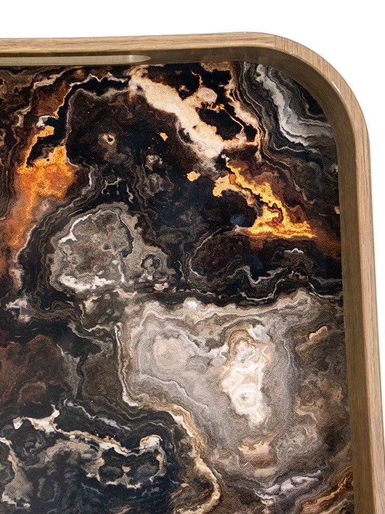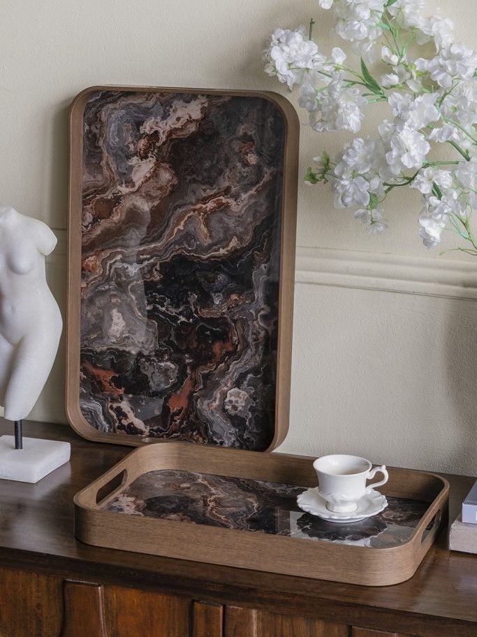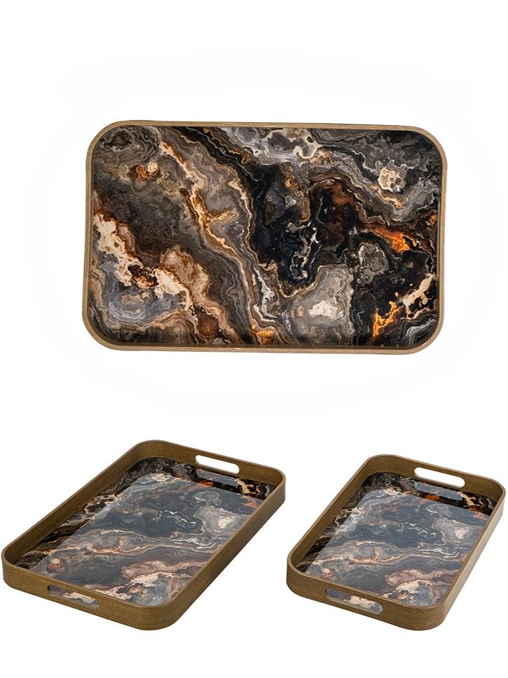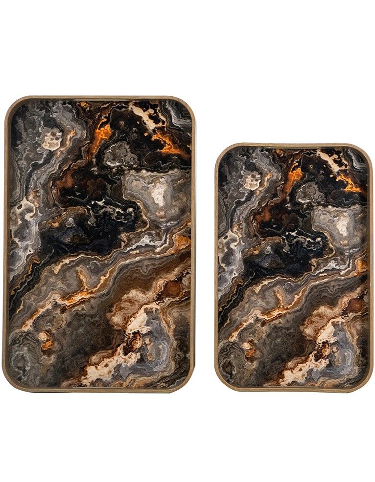 Сочетая в себе притягательность абстрактного искусства и природное очарование, представляем набор из двух подносов с элегантным прямоугольным силуэтом, золотистым напылением и узором под мрамор в оттенках черного, бронзового и медного, станут удобным и стильным дополнением для любой поверхности стола, серванта, комода или барной стойки. Контрастные золотые края и классическая форма позволяют изделиям дополнять переходный, современный и другие стили.