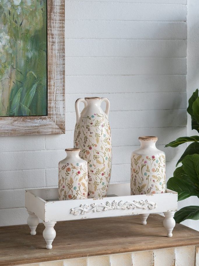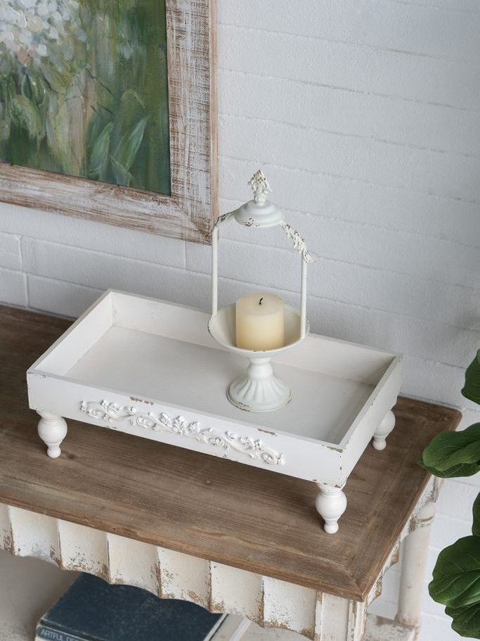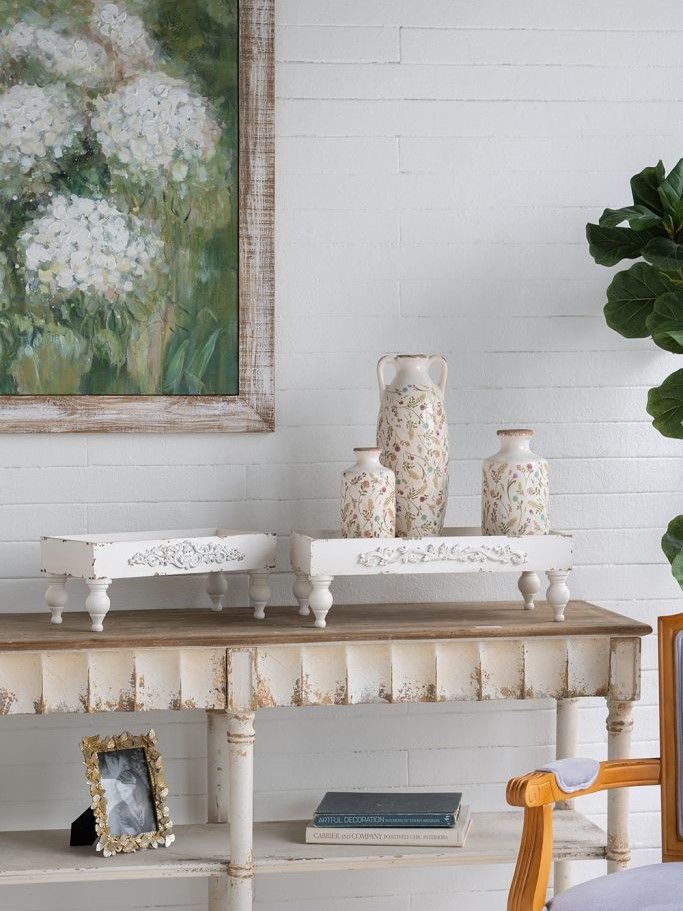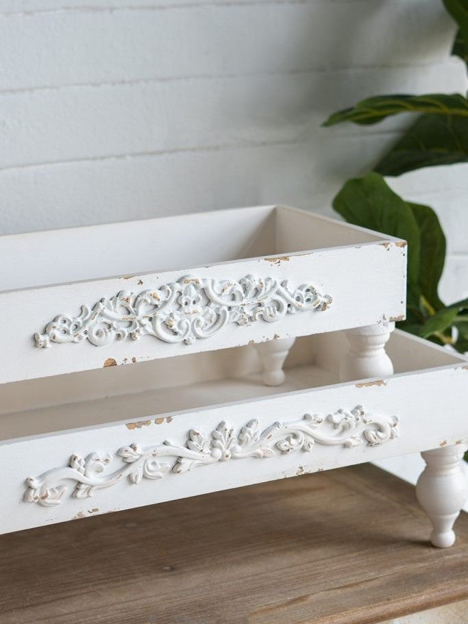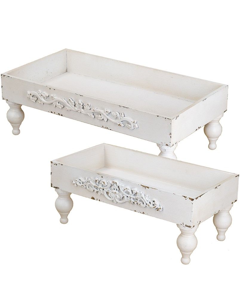 Набор из двух подставок, воплощающих элегантность винтажного французского дизайна, имеют прямоугольный силуэт, классические изогнутые ножки и состаренную белую отделку, украшенную античными элементами декора. Изделия идеально подходят для демонстрации ярких центральных элементов, растений в горшках или ювелирных изделий, станут стильным акцентом на любой поверхности стола, каминной полке или комоде. Потертая текстура и вид, как будто предметы сделаны вручную, позволяют этому набору сочетаться с французским кантри, фермерским, шебби-шиком и традиционными мотивами.