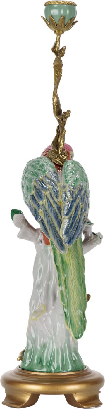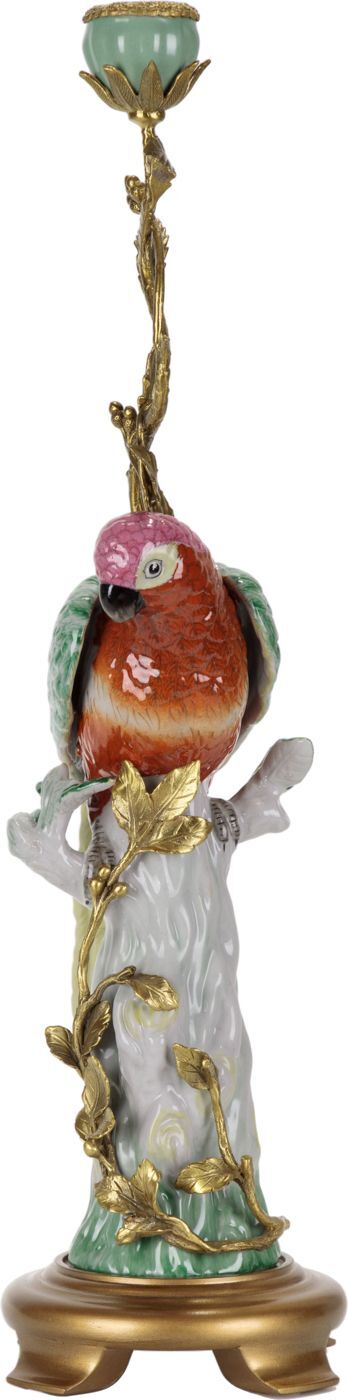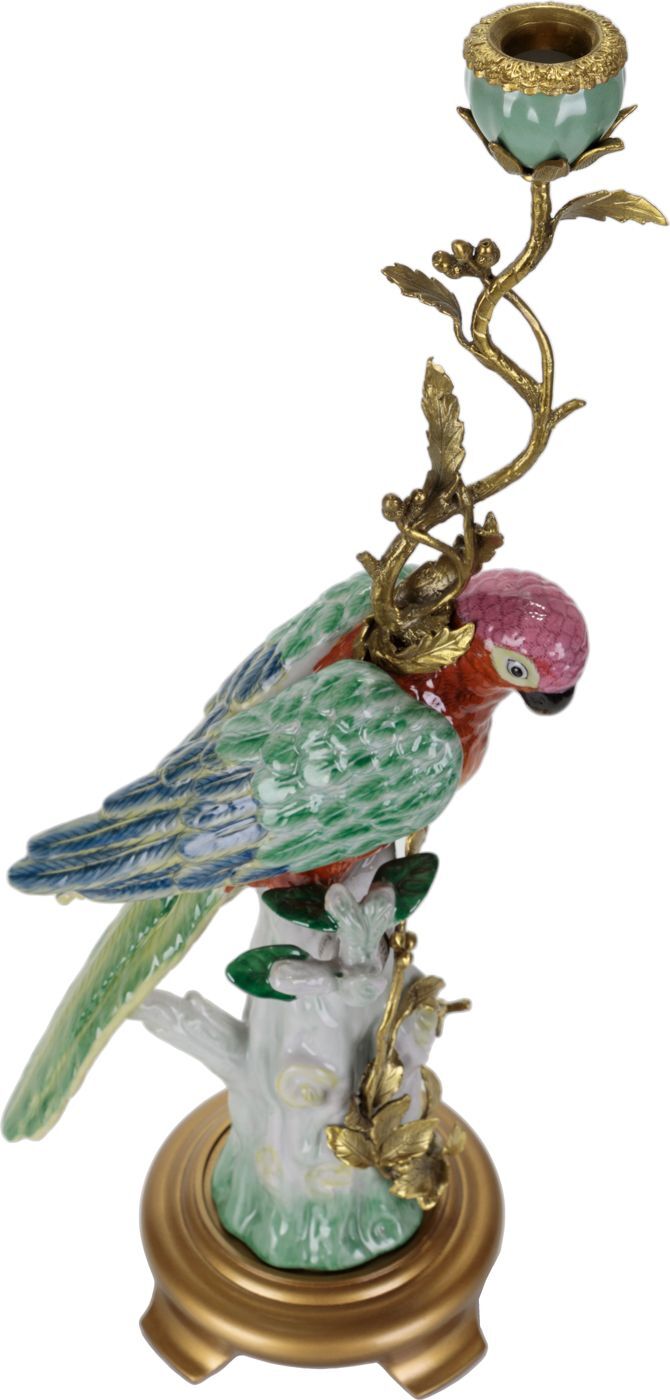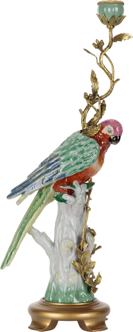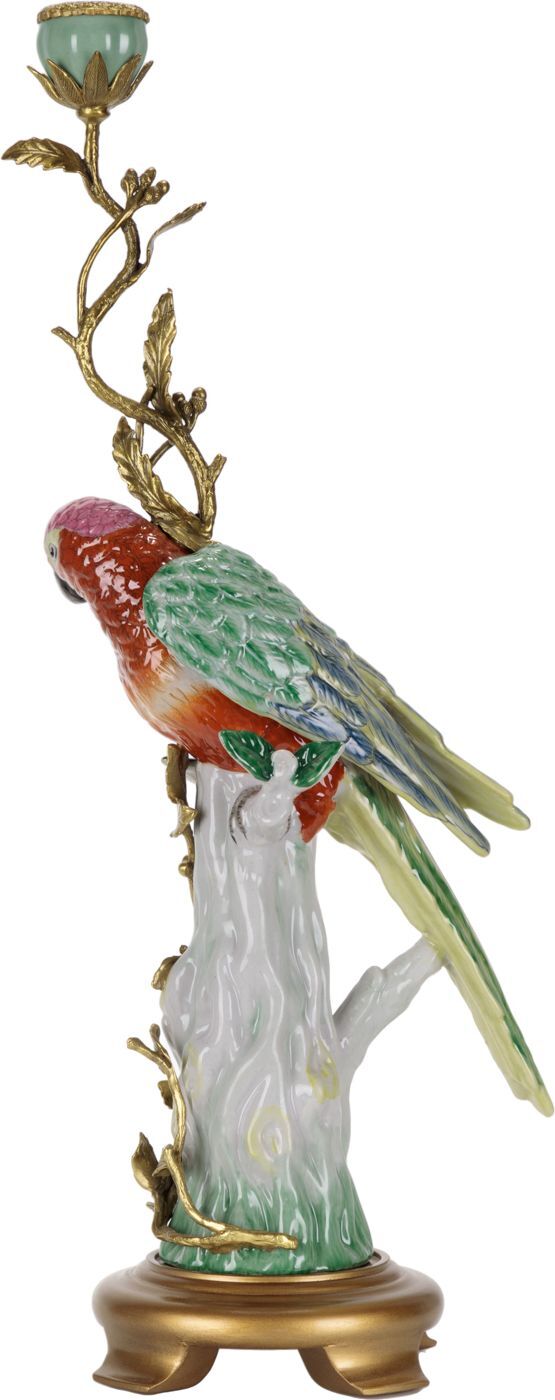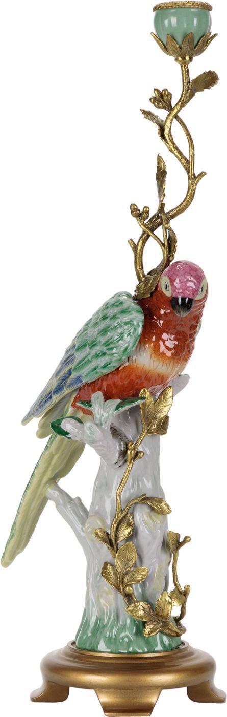 Подсвечник в образе попугая, выполненный из фарфора с бронзовыми элементами. Уникальное изделие ручной работы. При производстве этих художественных изделий из фарфора с бронзой используются вековые традиции китайских мастеров. Видимые трещинки (кракелюры) делаются по уникальной технологии, что придает более благородный вид старинного изделия.