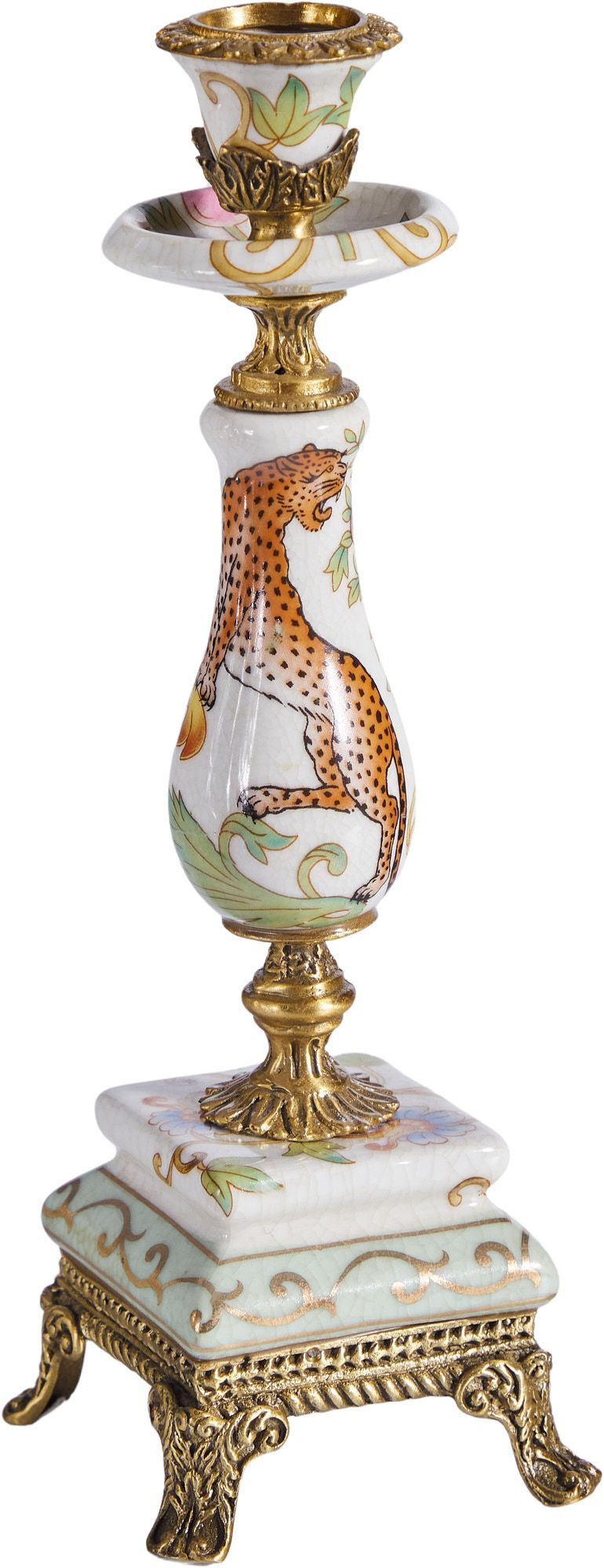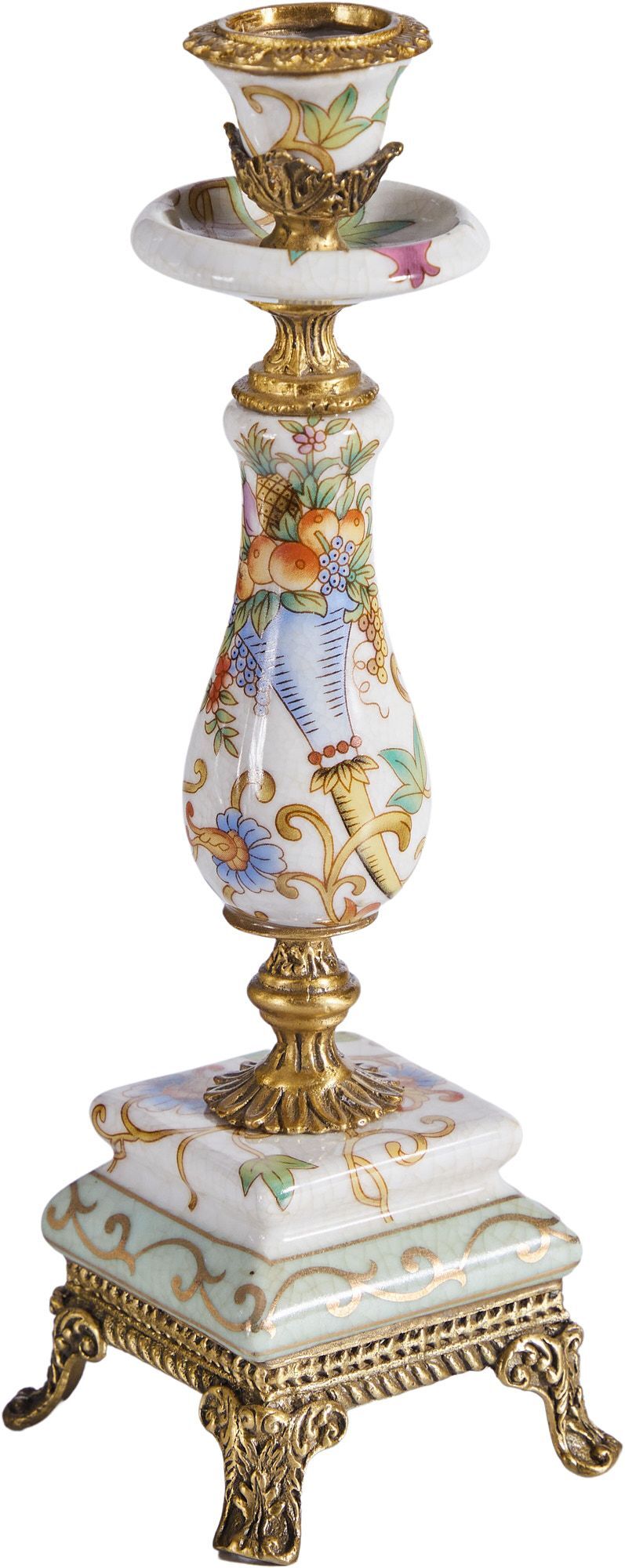 Подсвечник, выполненный из фарфора с бронзовыми элементами. Уникальное изделие ручной работы. При производстве этих художественных изделий из фарфора с бронзой используются вековые традиции китайских мастеров. Видимые трещинки (кракелюры) делаются по уникальной технологии, что придает более благородный вид старинного изделия.