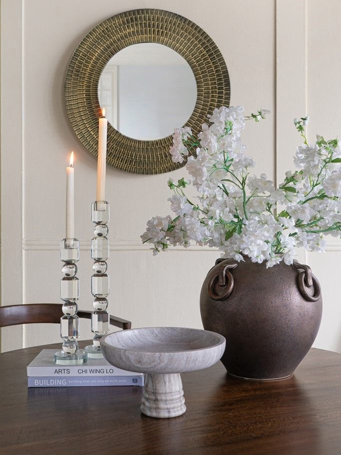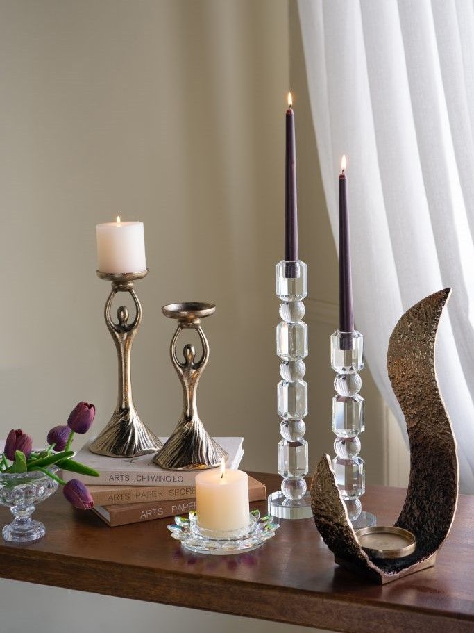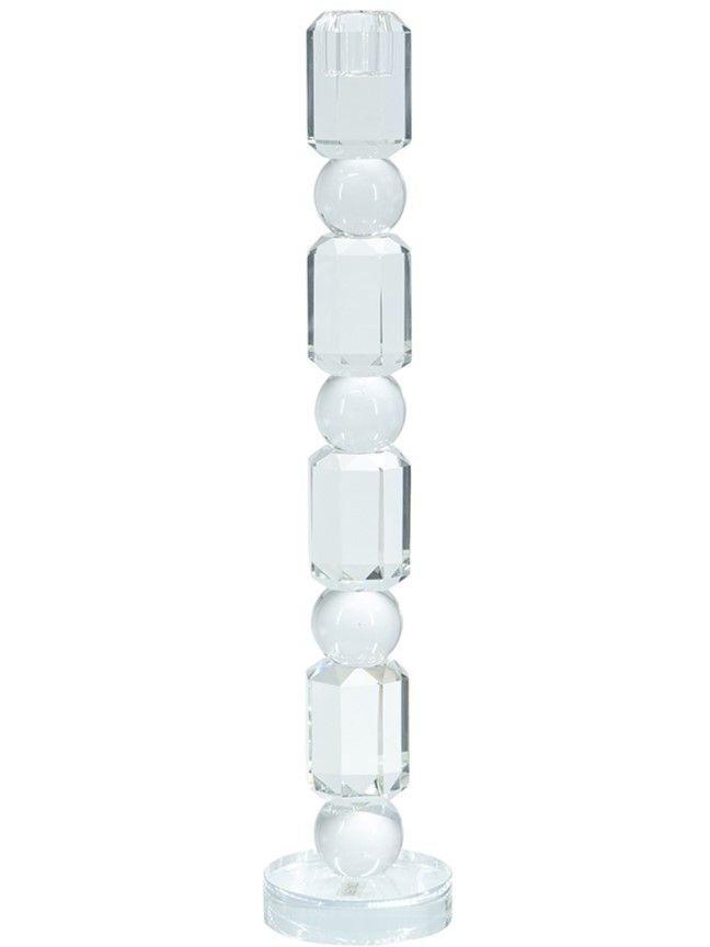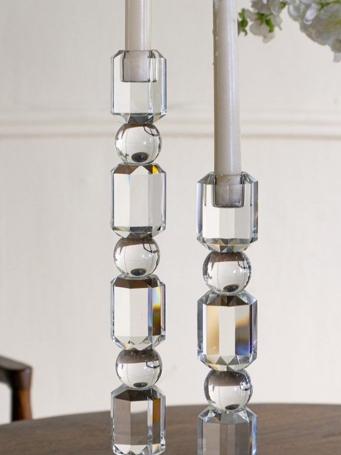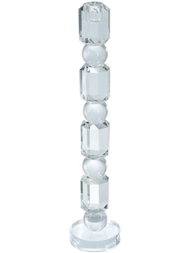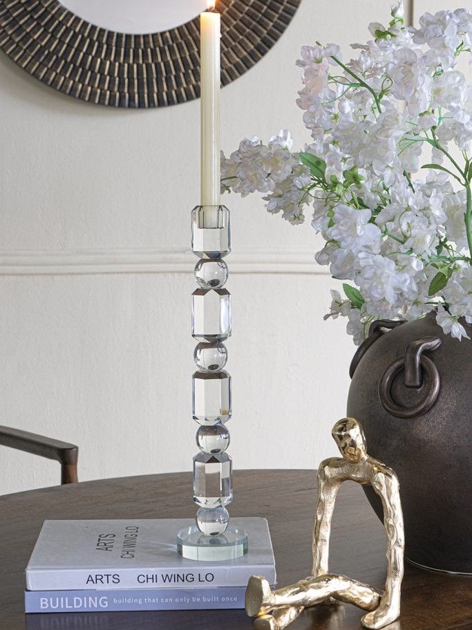 Роскошный вариант классического стеклянного подсвечника, отличается тонким, похожим на колонну, силуэтом, прозрачными мерцающими гранями, напоминающими хрусталь, и золотистыми вставками. Независимо от того, стоит ли подсвечник отдельно или украшен цветами и зеленью, однозначно придаст любому пространству изысканное очарование. Геометрический дизайн позволяет этому изделию сочетаться с современными, переходными, арт-деко и другими стилями, органично вписываясь в любой интерьер.