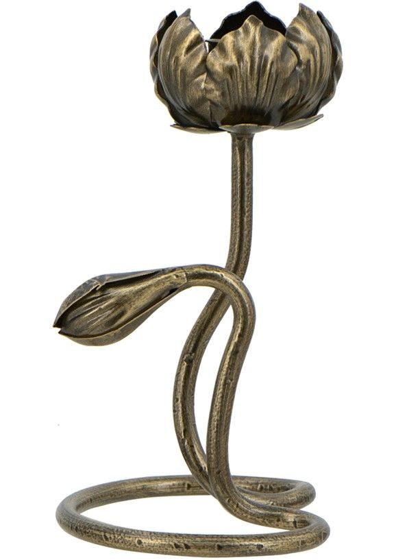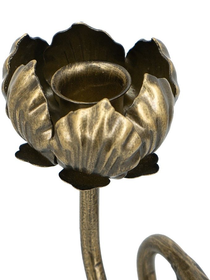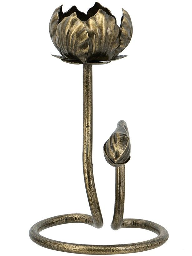 Утонченный подсвечник, вдохновленный непринужденной красотой природы, имеет изящный изогнутый цветочный силуэт с тонким стеблем и очаровательным держателем свечи в виде кувшинки. Выполненный из металла в цвете под античное золото, обязательно привлечет внимание в сочетании с коническими свечами. Скульптурный силуэт и винтажный стиль позволяют этому предмету интерьера дополнять французский кантри, традиционный, богемный и эклектичный стили.