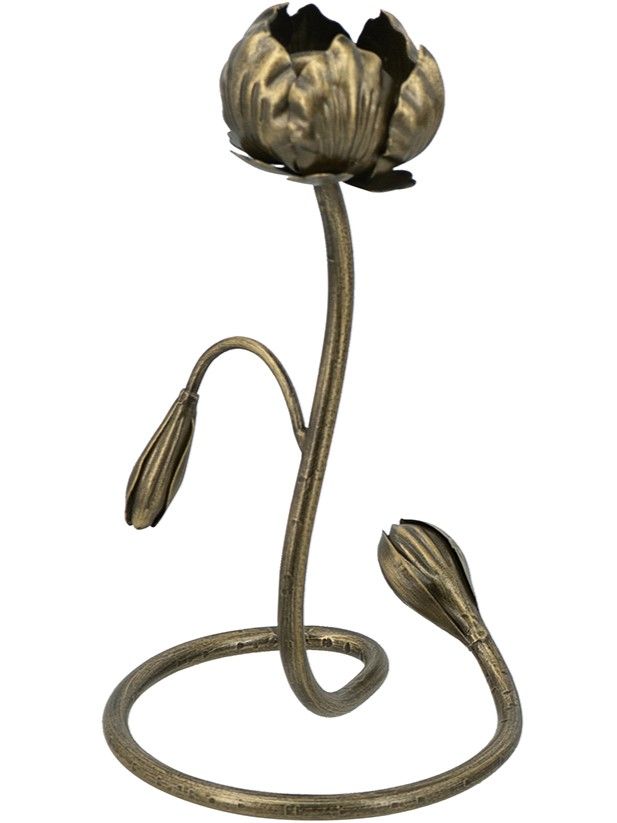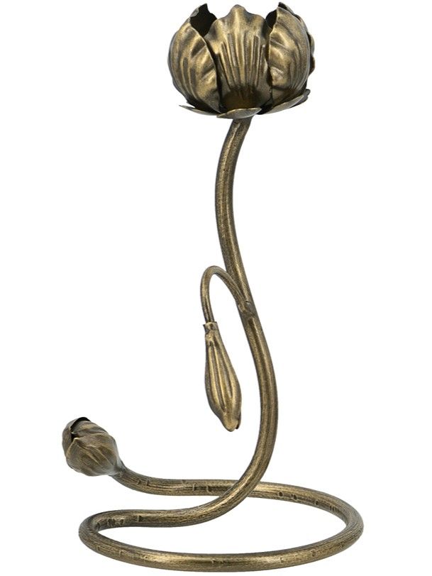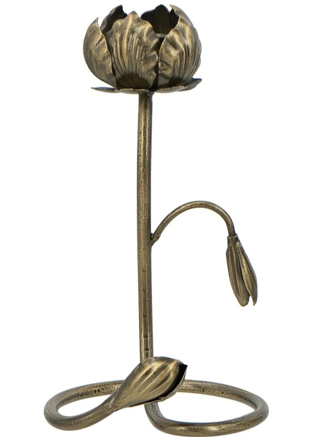 Утонченный подсвечник, вдохновленный непринужденной красотой природы, имеет изящный изогнутый цветочный силуэт с тонким стеблем и очаровательным держателем свечи в виде кувшинки. Выполненный из металла в цвете под античное золото, обязательно привлечет внимание в сочетании с коническими свечами. Скульптурный силуэт и винтажный стиль позволяют этому предмету интерьера дополнять французский кантри, традиционный, богемный и эклектичный стили.
