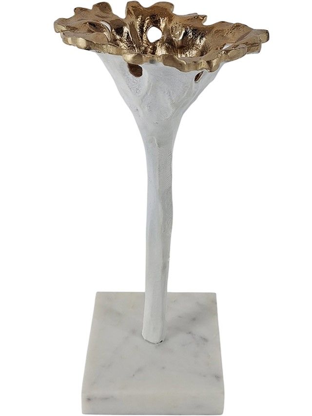 Изысканный подсвечник в виде распустившегося цветка, установленного на мраморное основание, представляет собой элегантный аксессуар, который имеет утонченный силуэт с белой и богатой золотистой отделкой. Поставьте изделие отдельно, со свечой или в сочетании с предметами из этой коллекции, наполните комнату теплым и успокаивающим свечением, органичной элегантностью и романтической атмосферой. Идеально подходит для размещения на каминной полке в гостиной, на обеденном столе в столовой, на кухонных просторах или на комоде в спальной комнате.