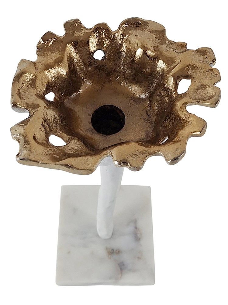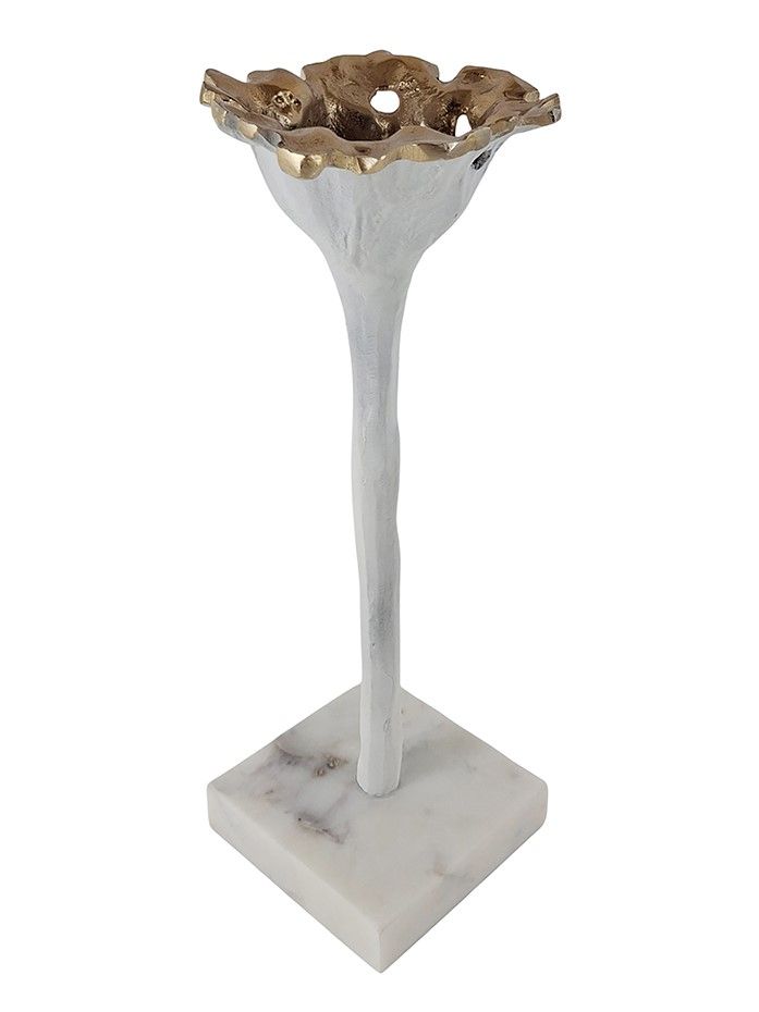 Изысканный подсвечник в виде распустившегося цветка, установленного на мраморное основание, представляет собой элегантный аксессуар, который имеет утонченный силуэт с белой и богатой золотистой отделкой. Поставьте изделие отдельно, со свечой или в сочетании с предметами из этой коллекции, наполните комнату теплым и успокаивающим свечением, органичной элегантностью и романтической атмосферой. Идеально подходит для размещения на каминной полке в гостиной, на обеденном столе в столовой, на кухонных просторах или на комоде в спальной комнате.