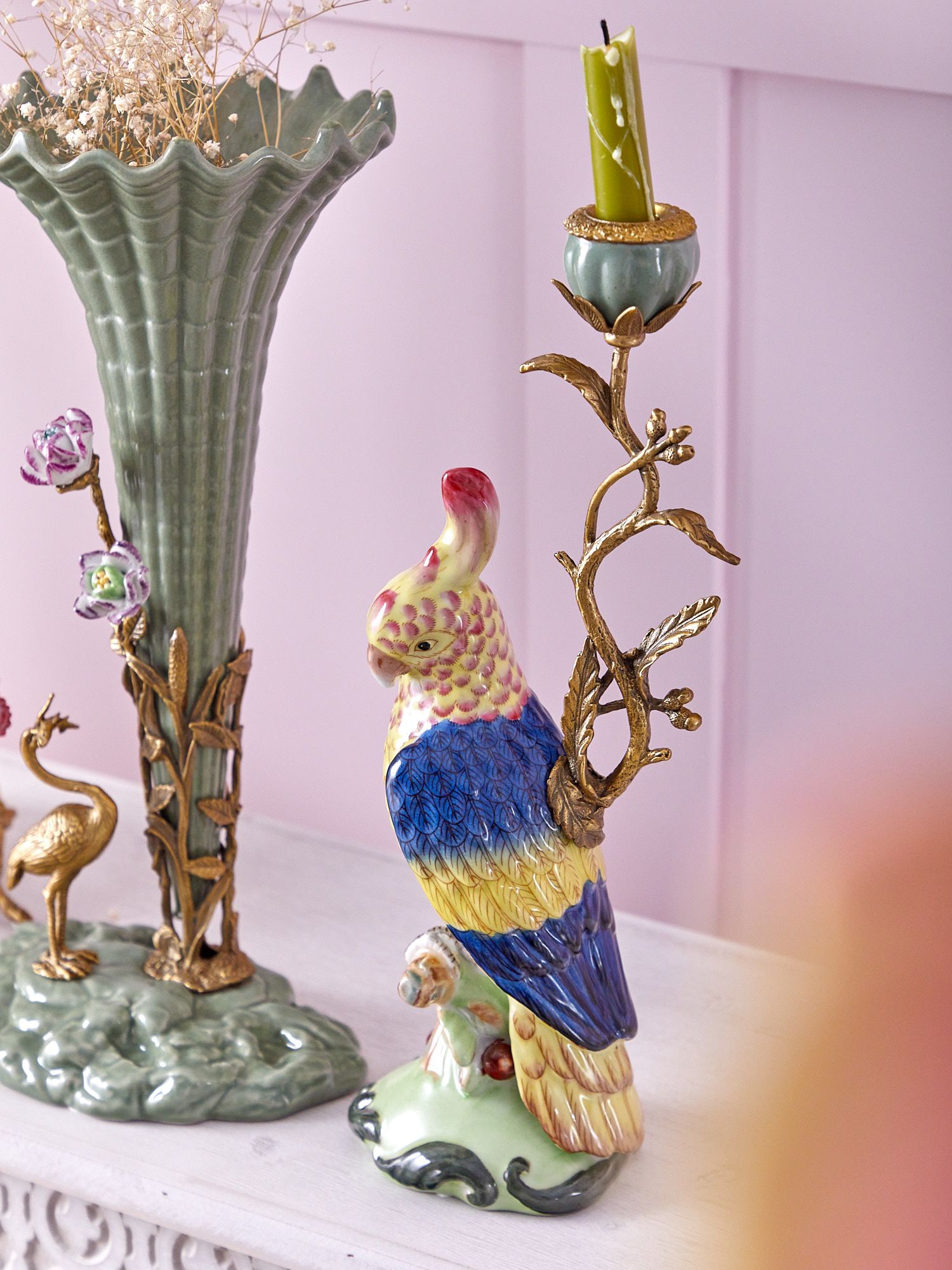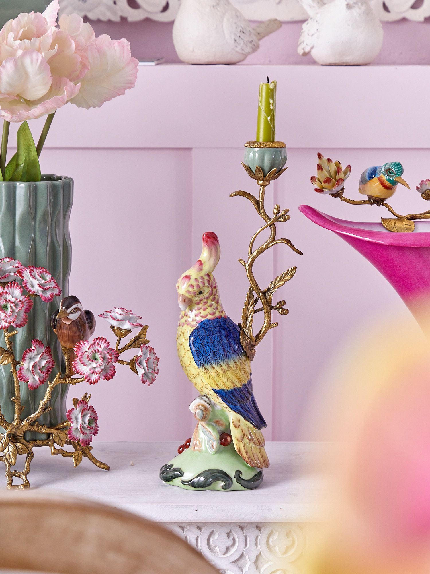Подсвечник в образе попугая, выполненный из фарфора с бронзовыми элементами. Уникальное изделие ручной работы. При производстве этих художественных изделий из фарфора с бронзой используются вековые традиции китайских мастеров. Видимые трещинки (кракелюры) делаются по уникальной технологии, что придает более благородный вид старинного изделия.