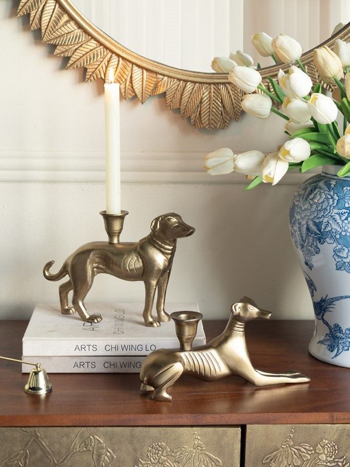 Акцентный подсвечник отличается элегантным силуэтом лежачей собаки с детализированной отделкой золотистого цвета. Украсьте письменный стол, книжную или каминную полку, это изделие наполнит любую комнату теплым успокаивающим светом и дополнит ваш интерьер, легко вписываясь в любую атмосферу дома. Замечательный вариант подарка для любителей собак.