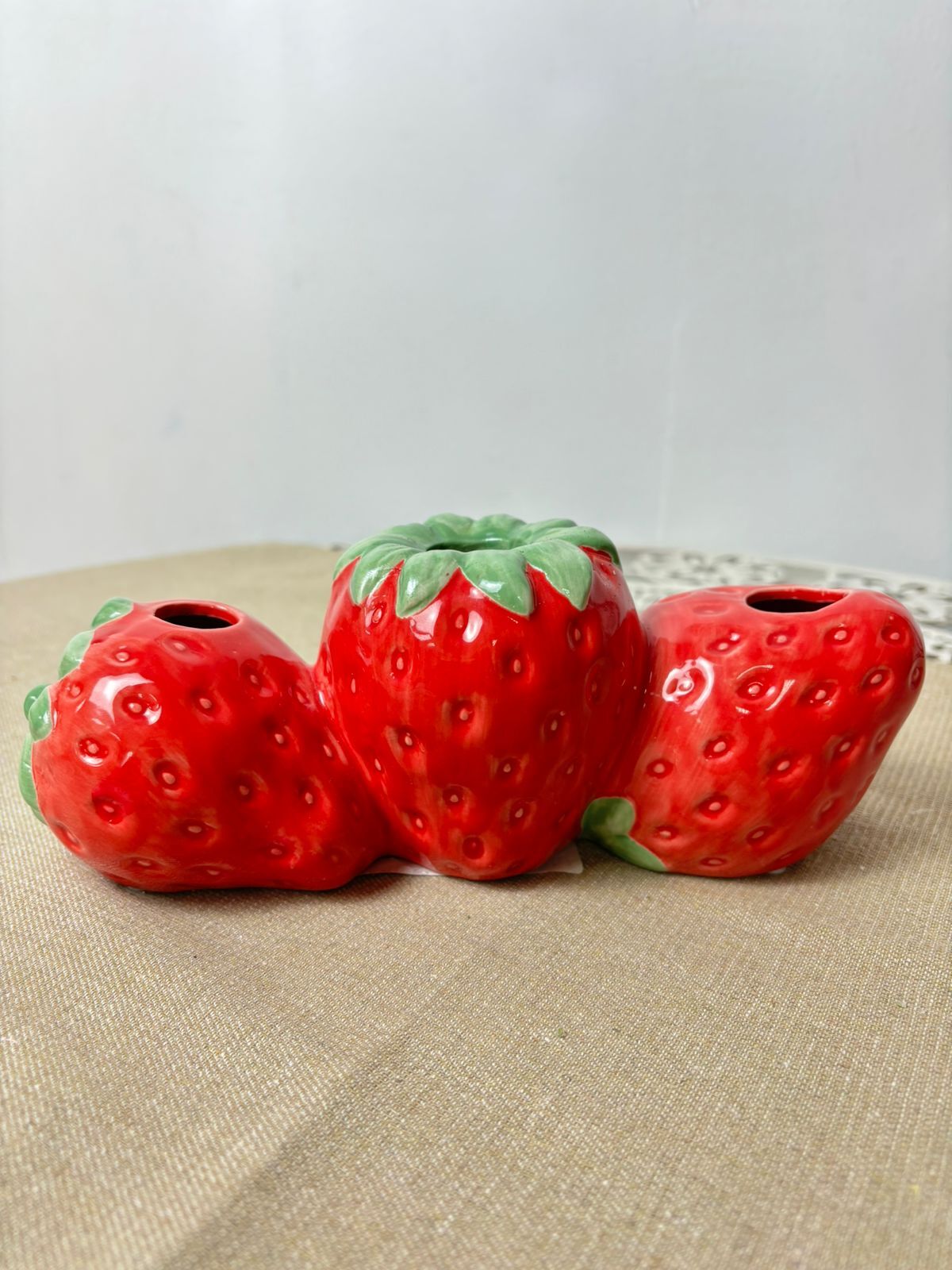 Дизайн подсвечника-вазы выполнен в форме клубники, что делает его не только функциональным, но и стильным элементом декора.