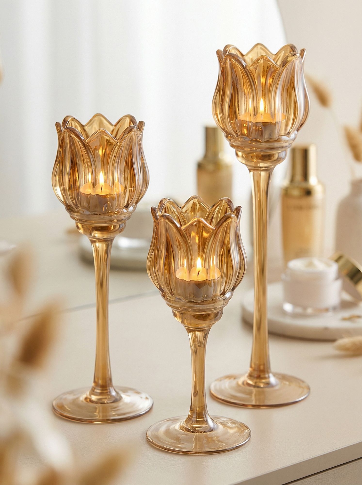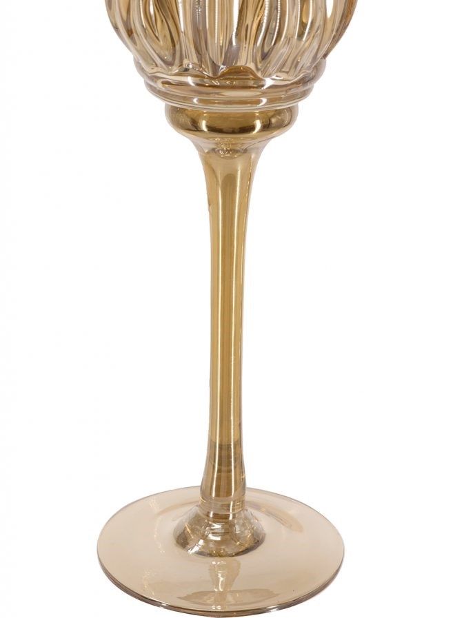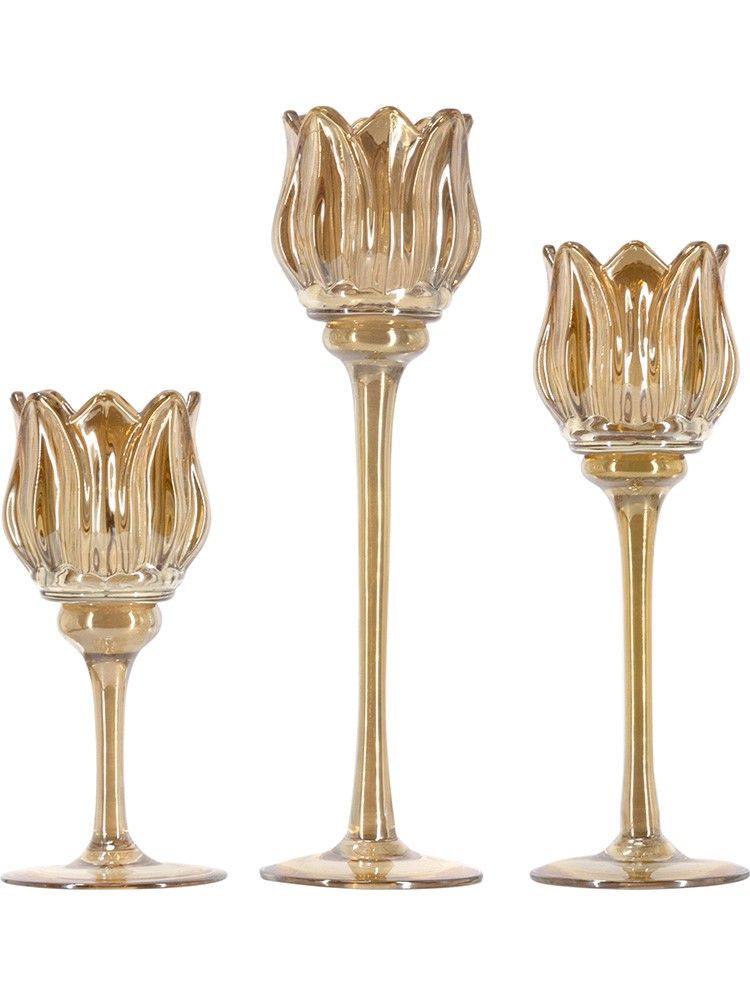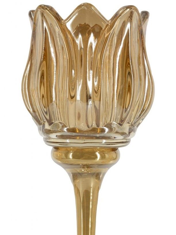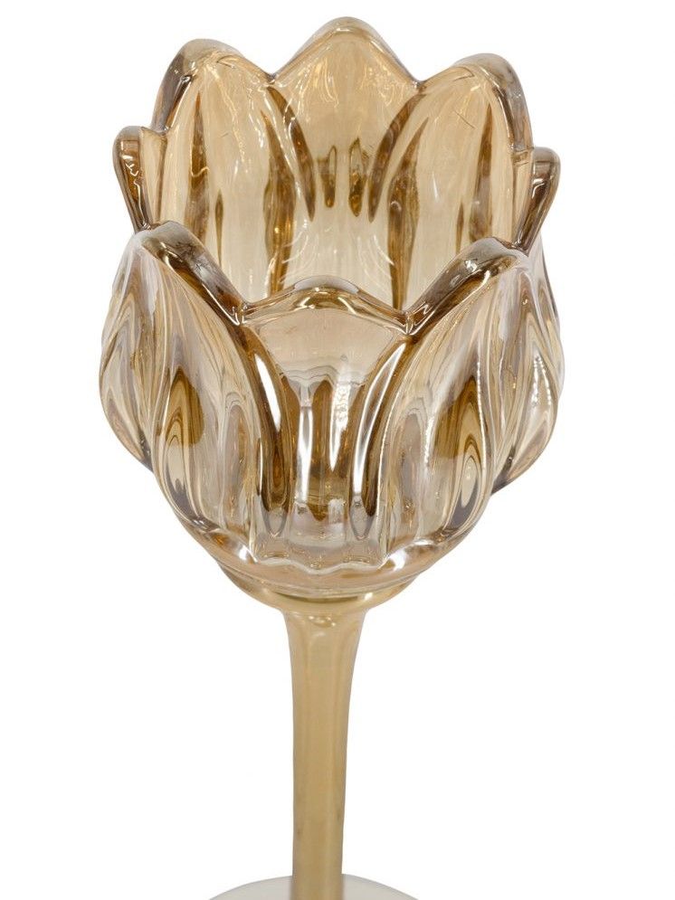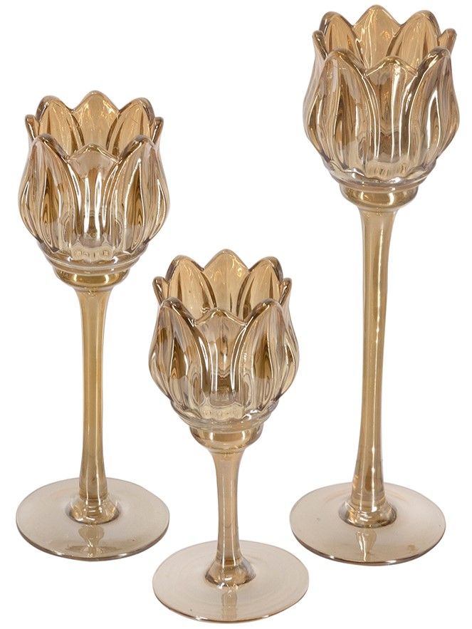Необычная форма и богатая отделка подсвечников, выполненных из дымчатого стекла в виде фужеров, позволяют им искриться в свете зажжённых свечей, отражая множеством бликов. Верхняя часть подсвечников украшена изысканной формой тюльпанов, создающих мягкое свечение и уютную атмосферу романтичного вечера.