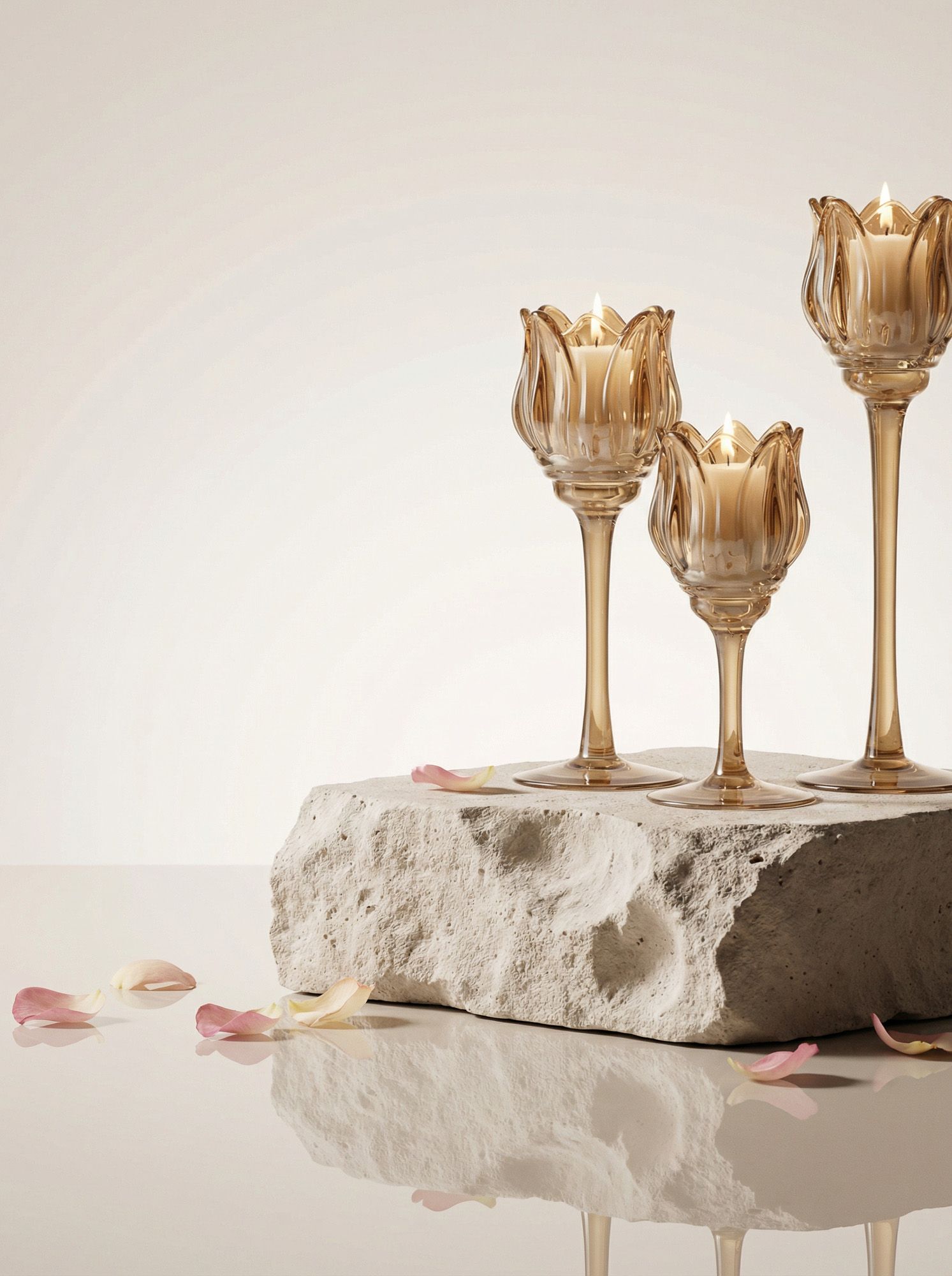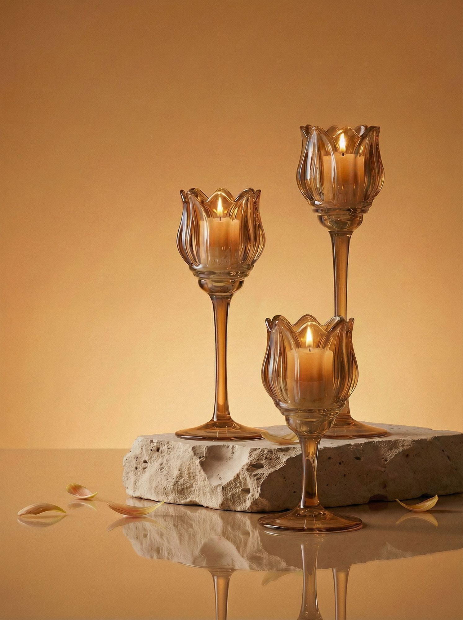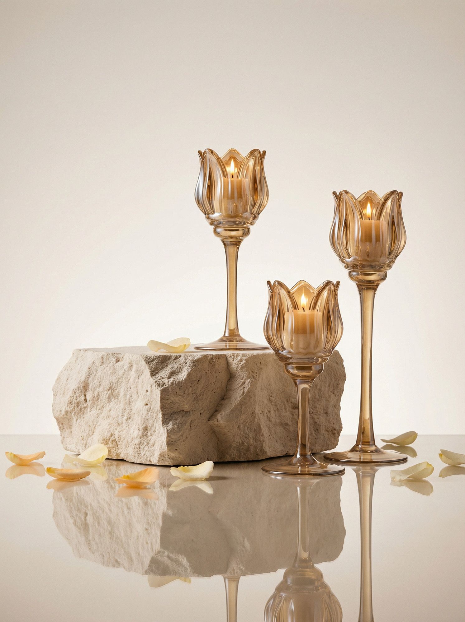 Необычная форма и богатая отделка подсвечников, выполненных из дымчатого стекла в виде фужеров, позволяют им искриться в свете зажжённых свечей, отражая множеством бликов. Верхняя часть подсвечников украшена изысканной формой тюльпанов, создающих мягкое свечение и уютную атмосферу романтичного вечера.