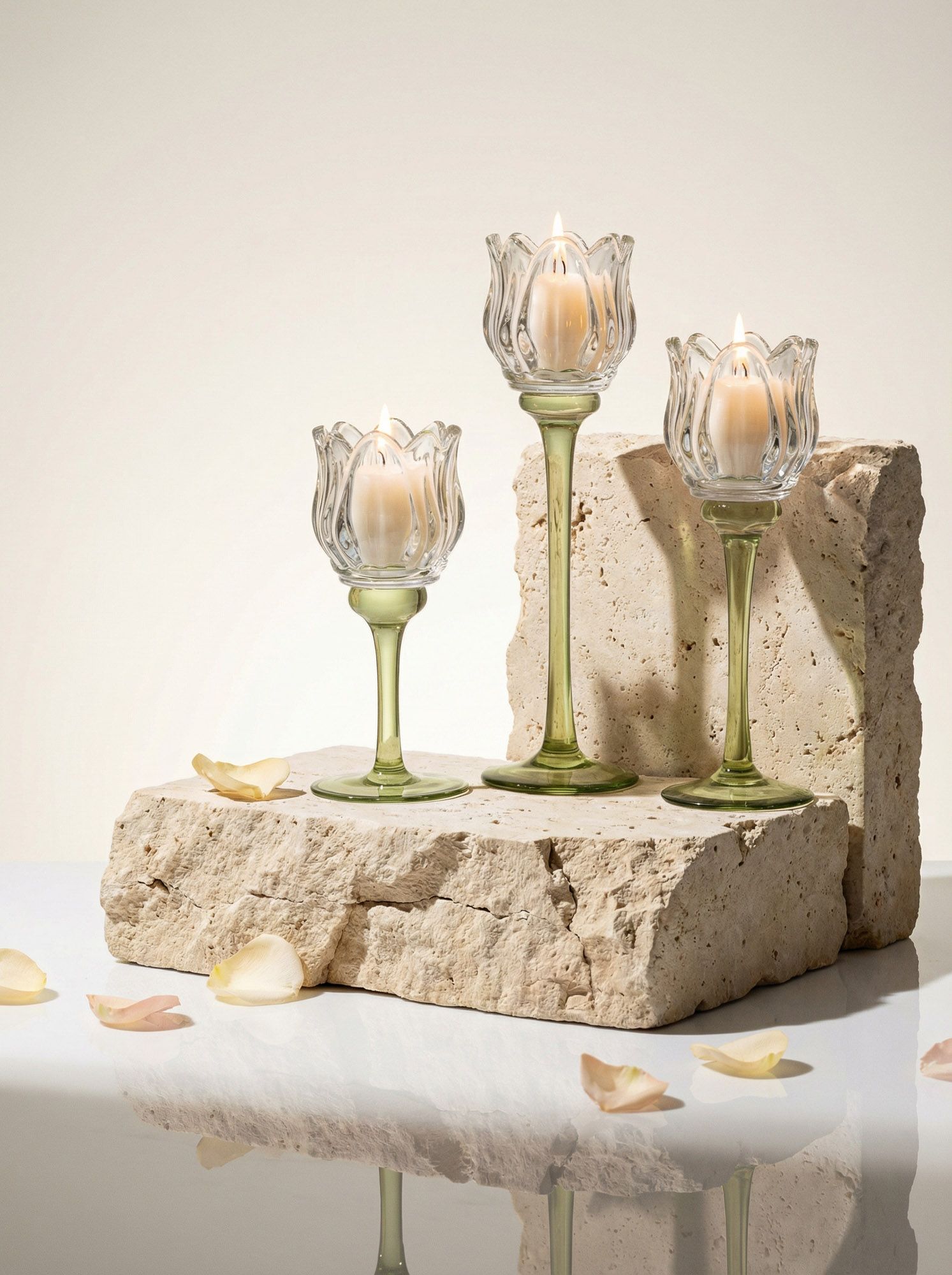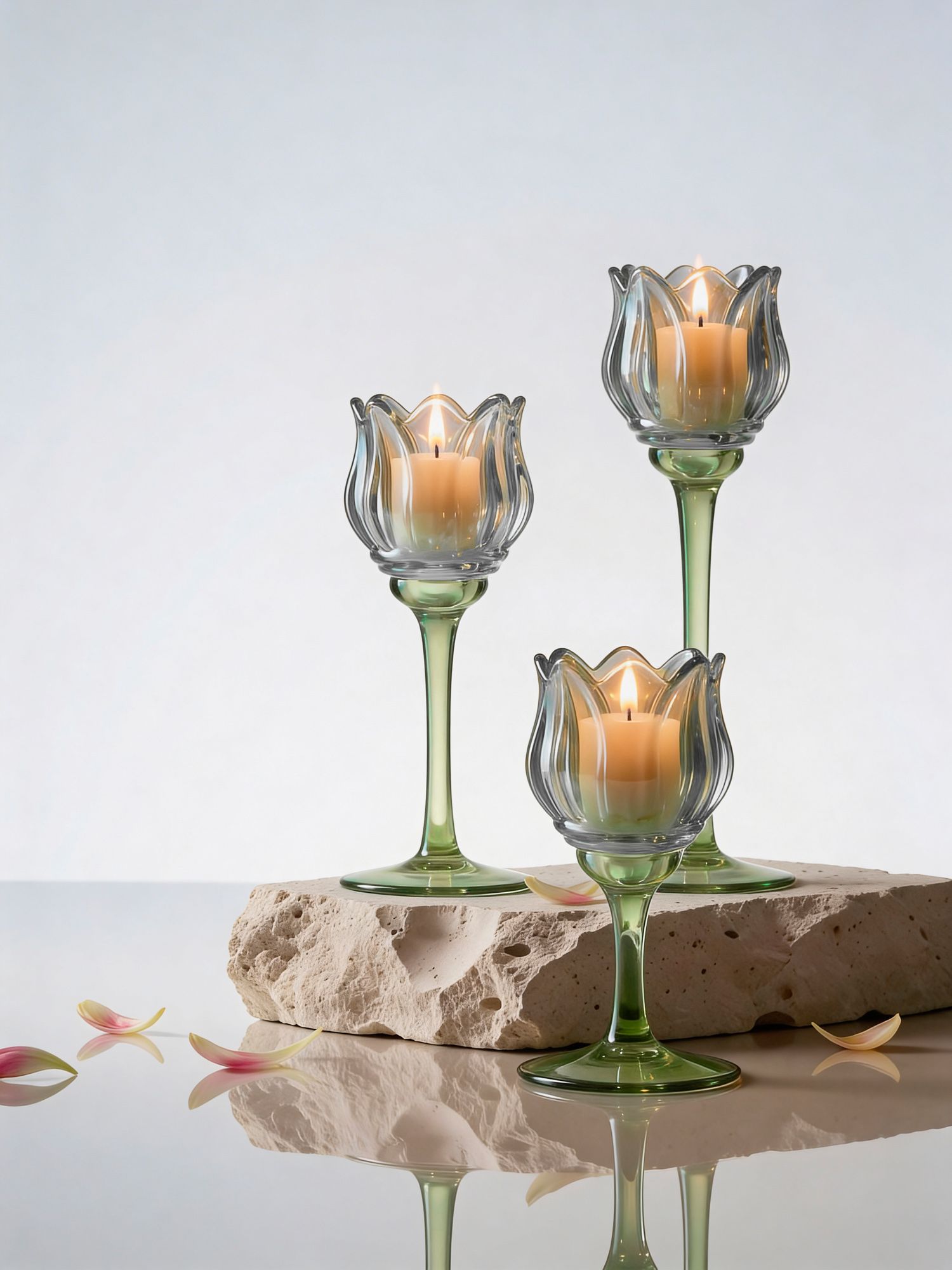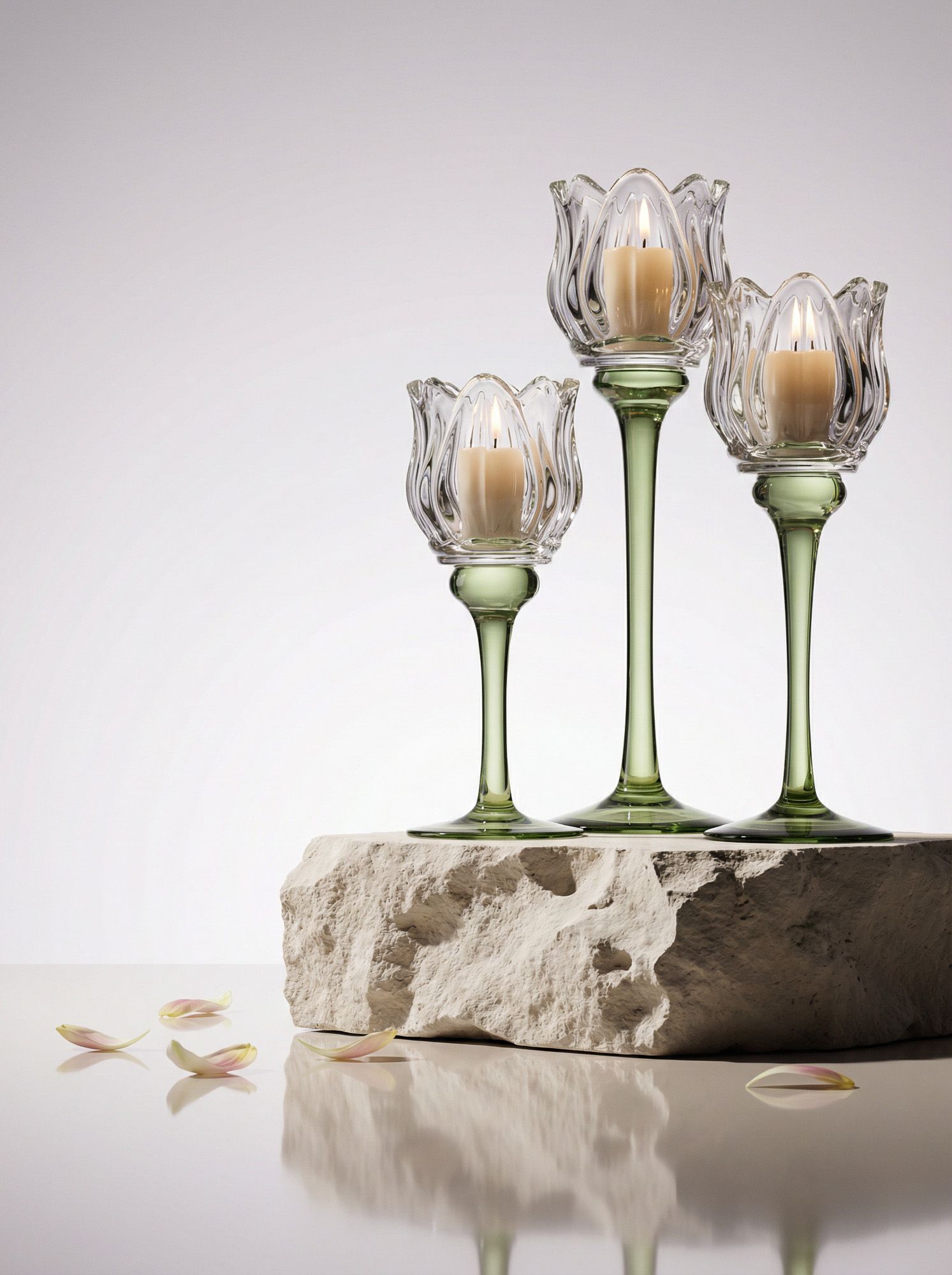 Необычная форма и богатая отделка подсвечников, выполненных из двуцветного стекла в виде фужеров, позволяют им искриться в свете зажжённых свечей, отражая множеством бликов. Верхняя часть подсвечников украшена изысканной формой тюльпанов, создающих мягкое свечение и уютную атмосферу романтичного вечера.