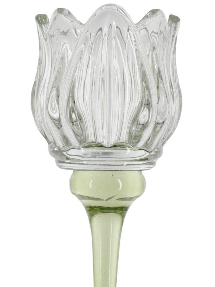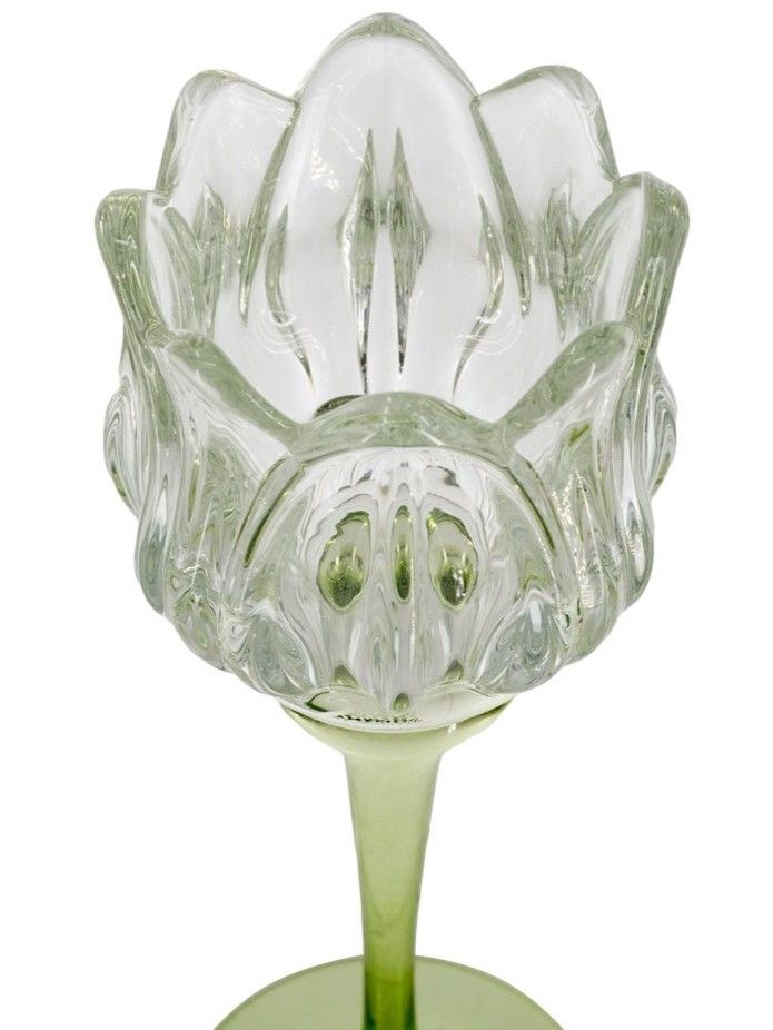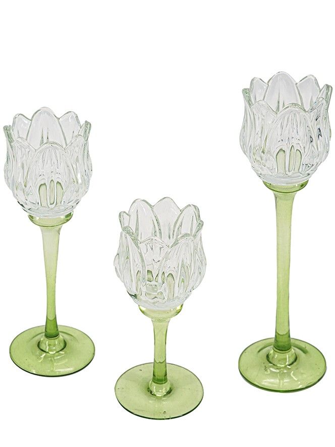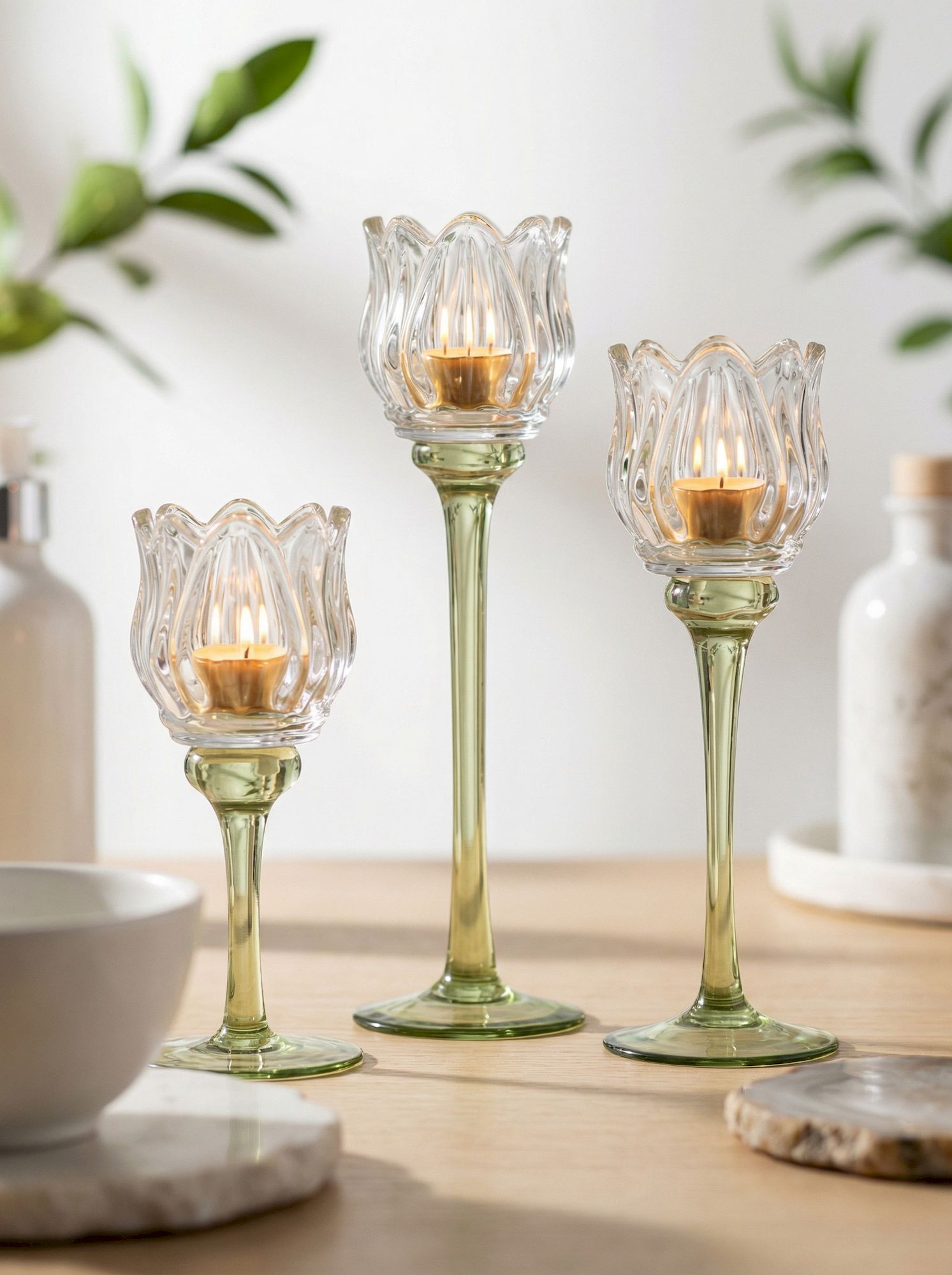 Необычная форма и богатая отделка подсвечников, выполненных из двуцветного стекла в виде фужеров, позволяют им искриться в свете зажжённых свечей, отражая множеством бликов. Верхняя часть подсвечников украшена изысканной формой тюльпанов, создающих мягкое свечение и уютную атмосферу романтичного вечера.