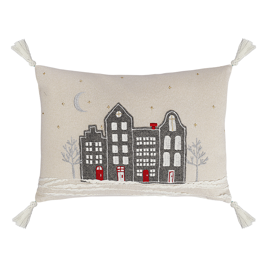 "Подушка декоративная Snowy Town из коллекции New Year Essential добавит нотку волшебства в любое пространство, создав в нем атмосферу теплоты и уюта. Изображение заснеженных домиков и декор в виде кисточек дарят приятные эмоции и оживляют дизайн. Подушка идеально подходит для гостиной, спальни или детской комнаты.