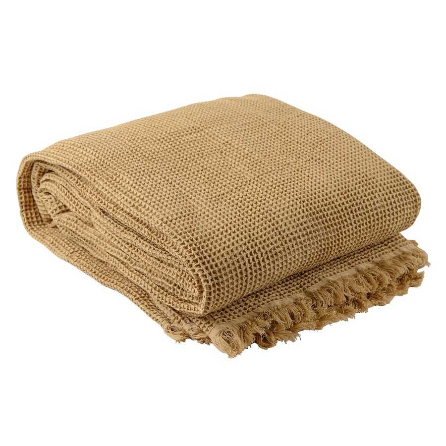 "Покрывало вафельное из хлопка светло-коричневого цвета из коллекции Essential станет необычным акцентом в интерьере благодаря своей интересной фактуре. Мягкое и приятное на ощупь – оно создано, чтобы дарить тепло и делать любое пространство уютным и комфортным. Им можно красиво застелить диван или кровать, а также использовать его в качестве пледа.