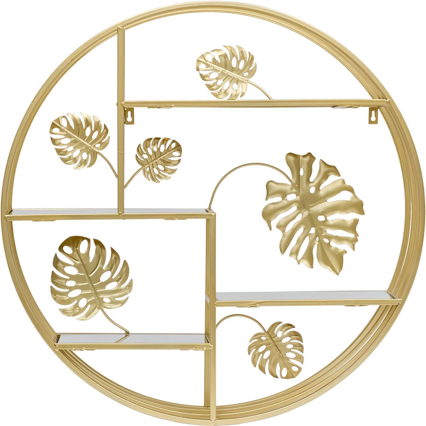 Настенная полка из металла, украшенная листьями тропических растений, разнообразит любой интерьер. Зеркальные полочки придают блеск и изящество, отображая поставленные на них изделия.