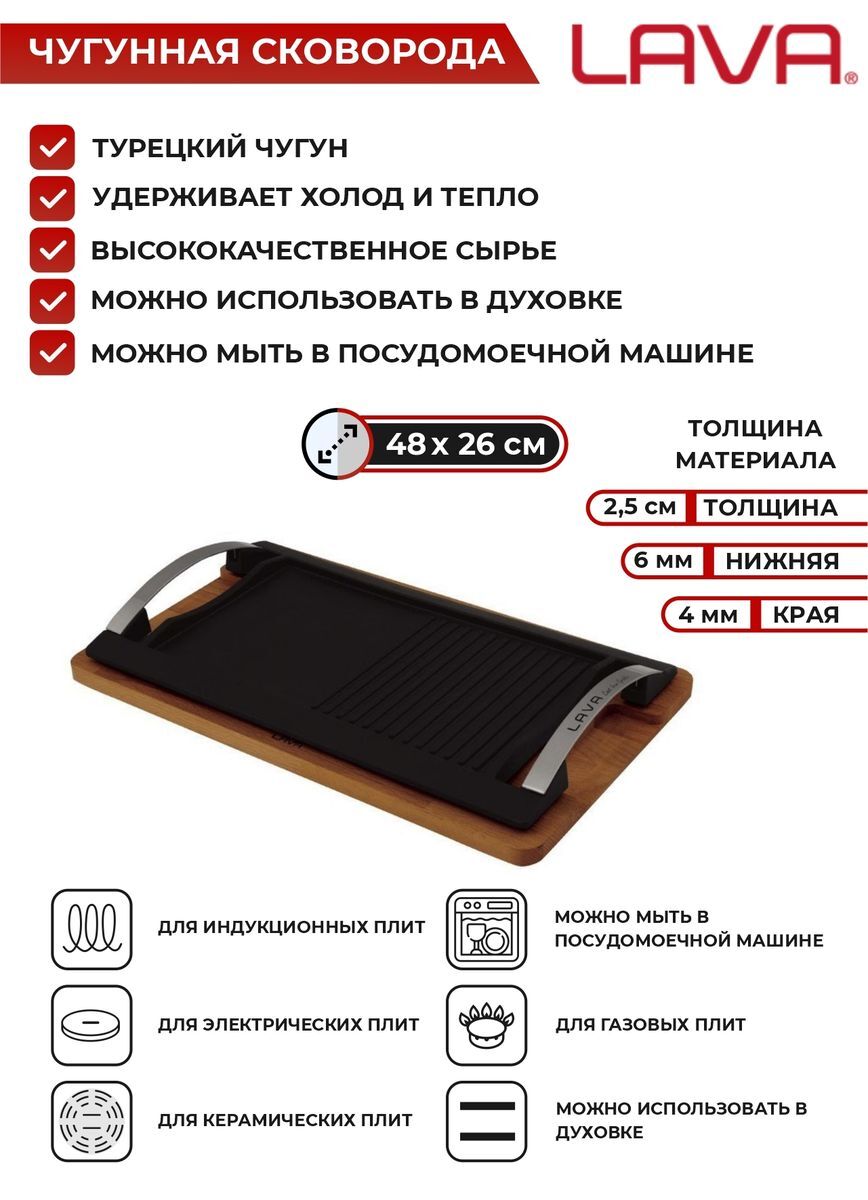 Прямоугольная плита/сковорода гриль с двумя декоративными металлическими ручками и деревянным подносом 48x26cm.