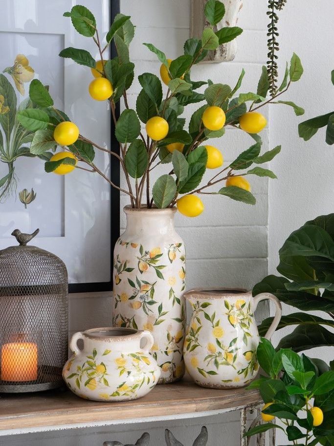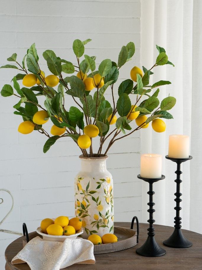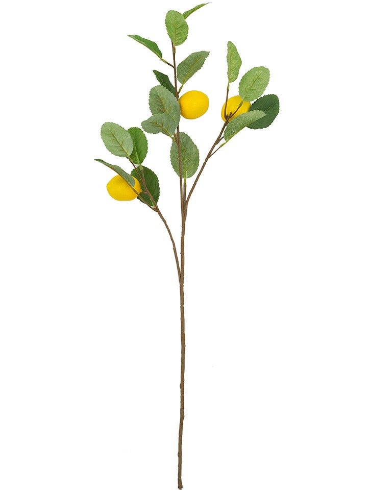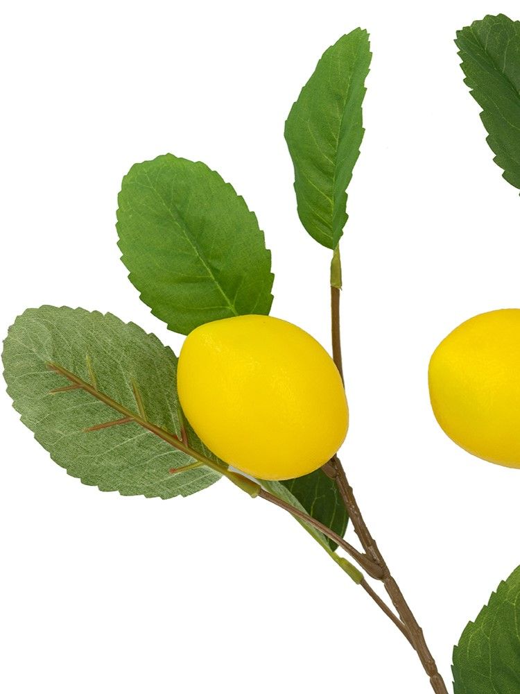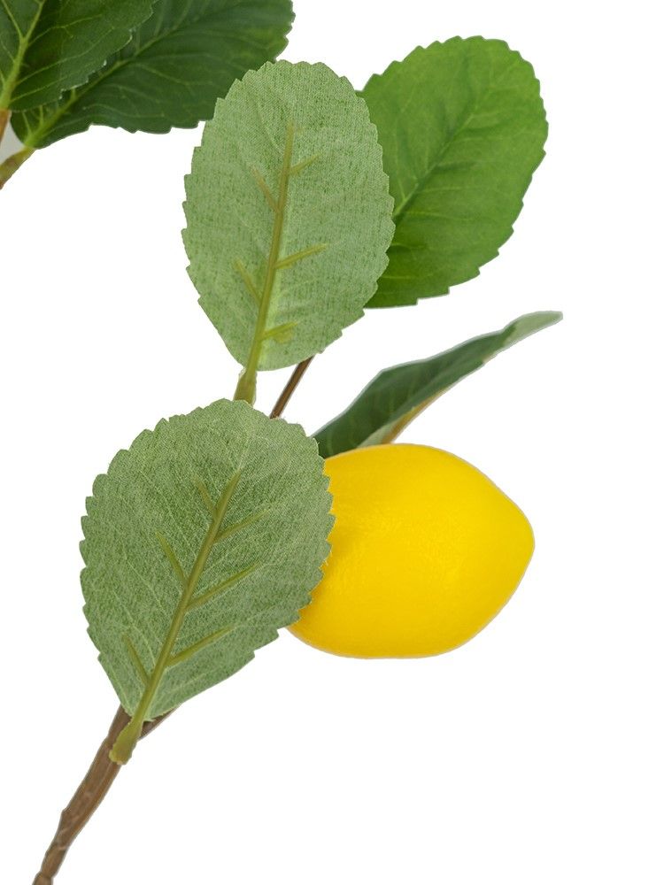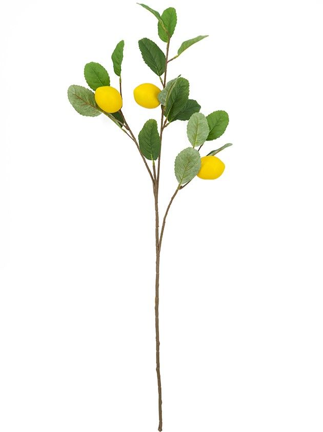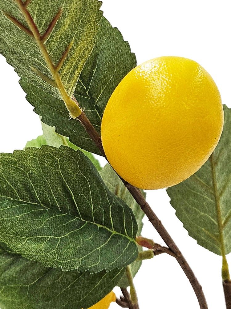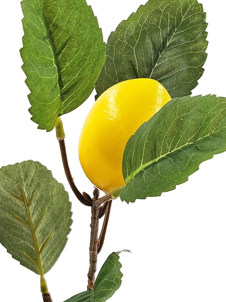 Яркое очарование природы представляет собой тонкую коричневую ветку, украшенную реалистичными круглыми листьями и ярко-желтыми лимонами. Плоды лимона олицетворяют спасение, верность в любви, чувственные наслаждения и символизирует плодородие. Изделие можно использовать для создания индивидуального образа в букете, поставить в высокую вазу или дополнить любую роскошную композицию из цветов.